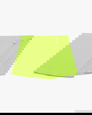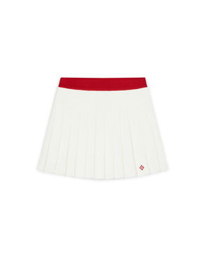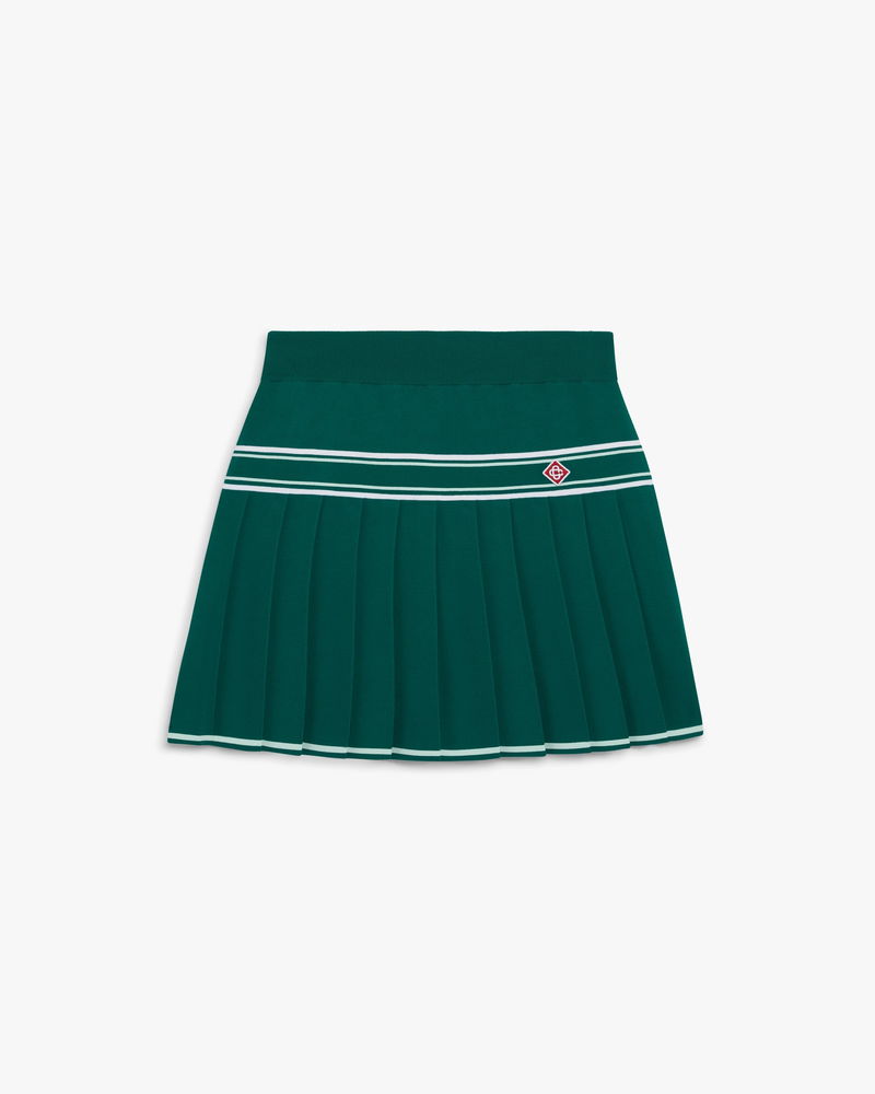 The green pleated knit mini skirt is a refined design featuring the house's signature diamond logo. Completed with a yoke featuring stripe detail, and a pleated panel with horizontal stripe hem detail for a feminine silhouette.