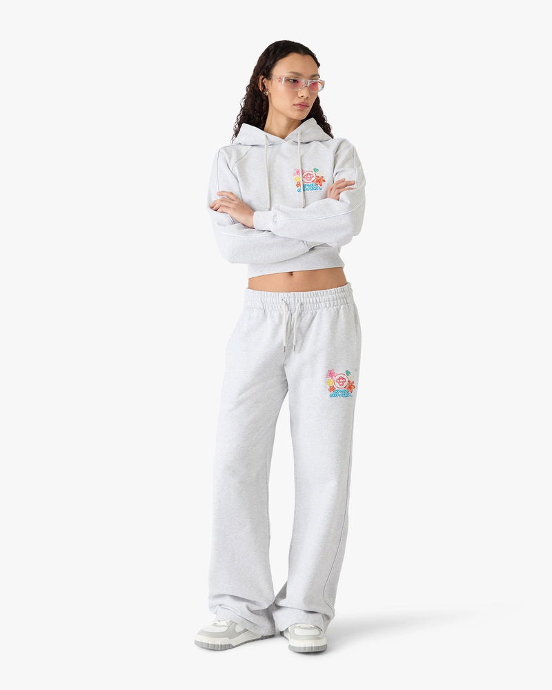 The grey embroidered cropped sweatpants are a refined design, featuring the season's graphic collage artwork representing the iconography and design elements for the new season with interpretations of the logo, smiley face and the orchid flower. Completed with an elasticised waistband, drawstring fastening, piping details down the sides, in-seam pockets, and a back patch pocket. Designed to be worn with the coordinating hooded sweatshirt.