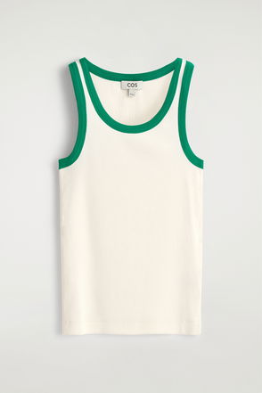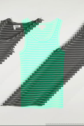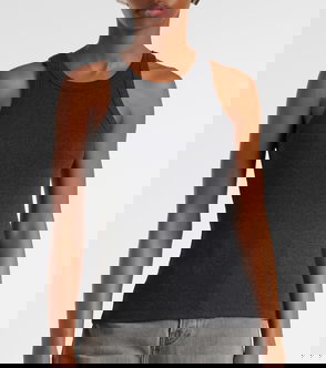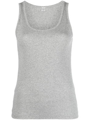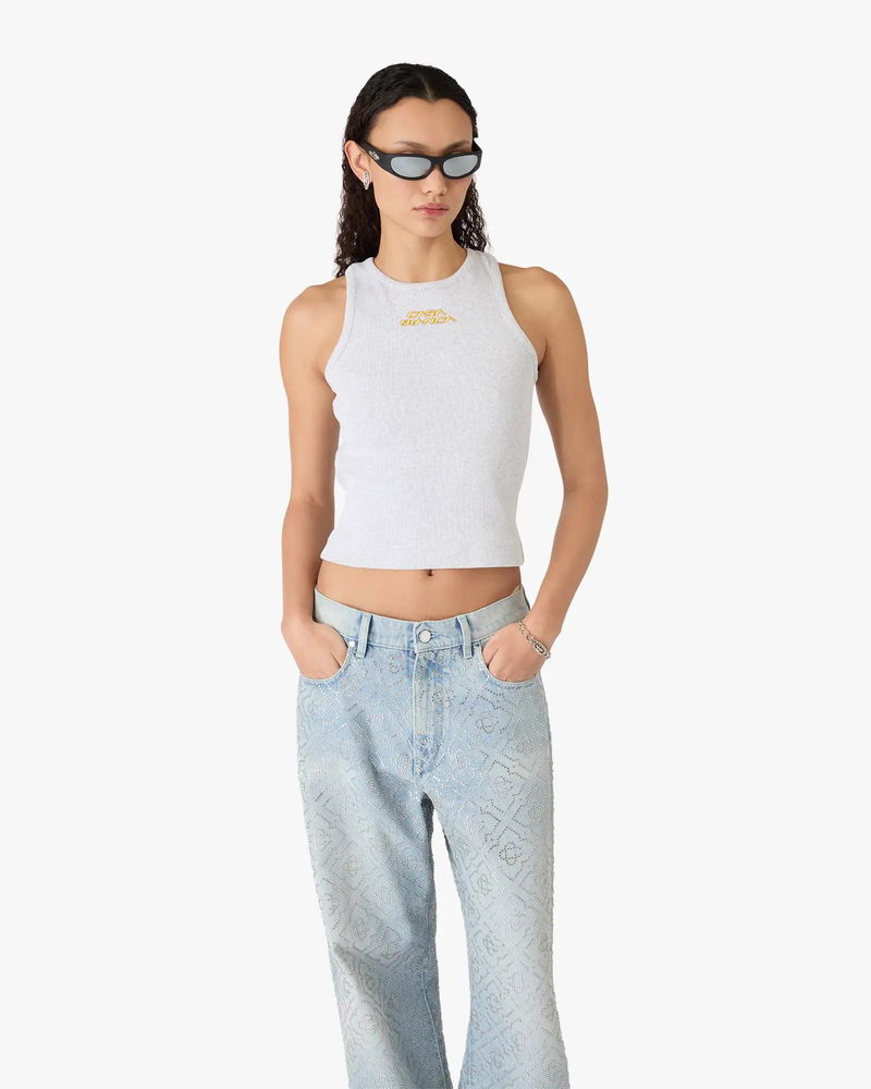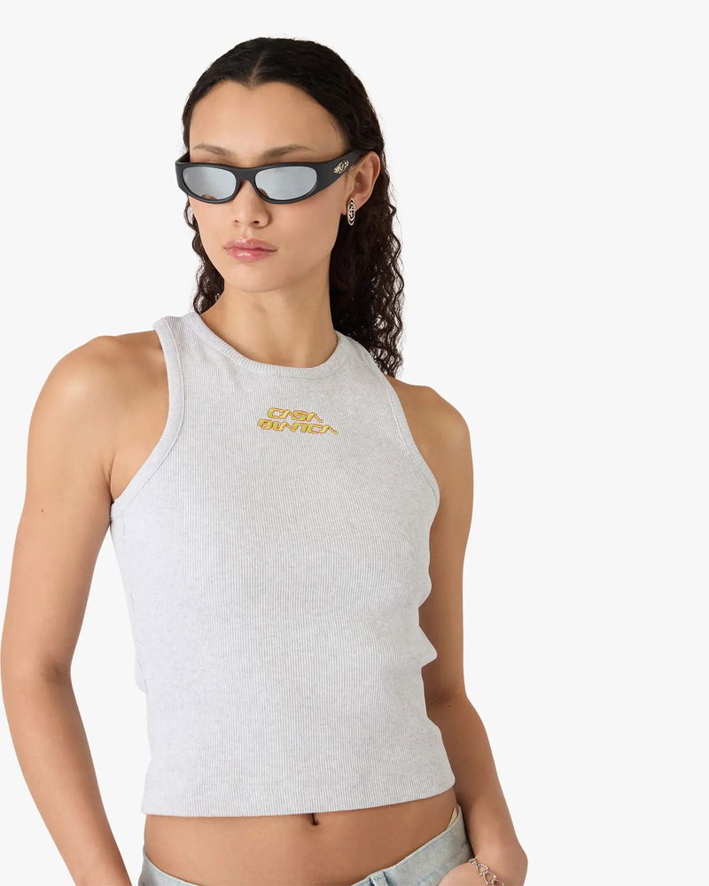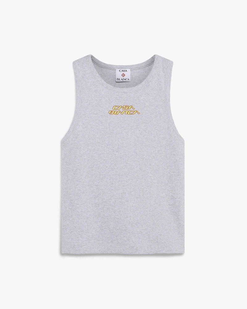 The grey marle ribbed tank top is a sleeveless design, featuring the house's signature Casablanca logo. Completed with stripe detailing around the crew neckline and armholes, with a racer-back silhouette embodying the house's elevated approach to essential pieces.