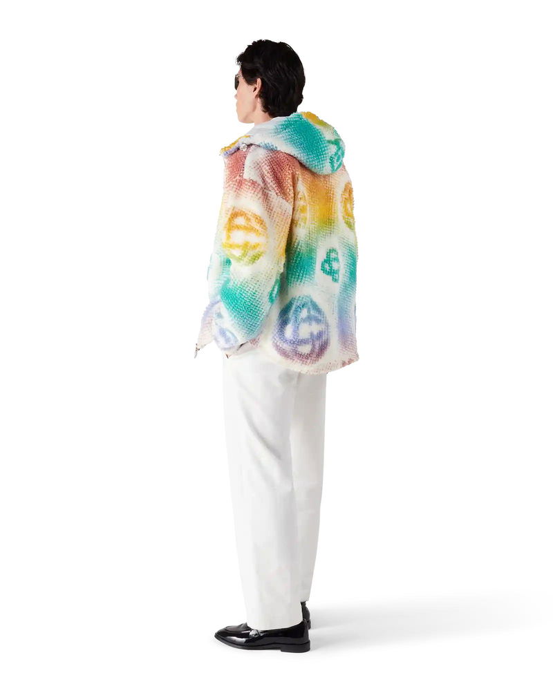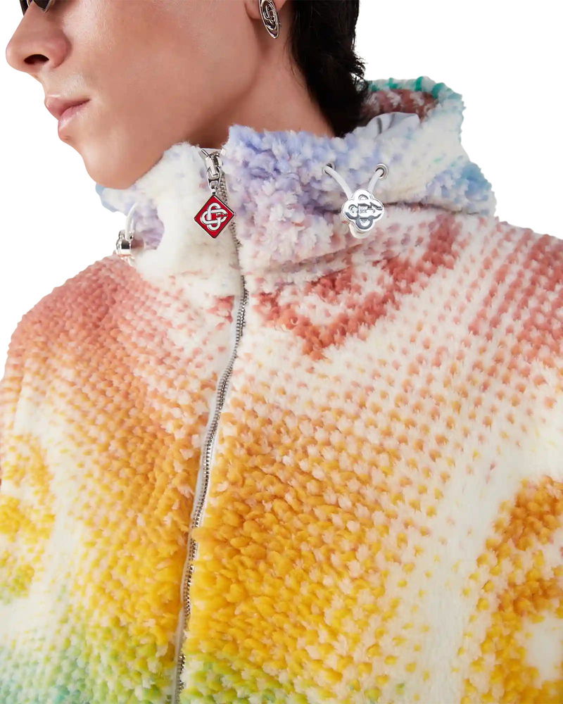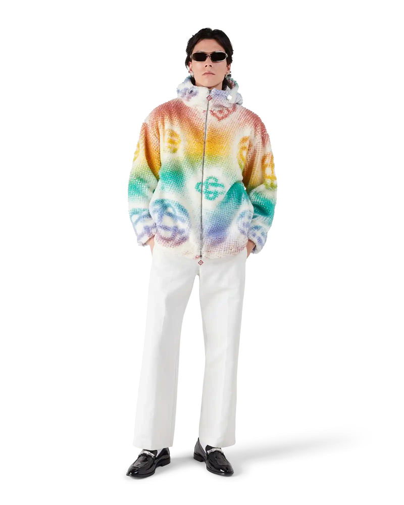 The Halftone Monogram fleece jacket is a long-sleeve all-over printed contemporary design featuring the house's monogram rendered in halftone using airbrushing, building on our previous experiments with the technique. Completed with a hood, drawstring fastening with interlocking CC logo toggles, zip closure featuring the house's signature diamond logo tab. Printed fleece fabric 58% modacrylic 38% polyester 6% wool Lining: 76% viscose 24% polyester Specialised dry clean only Made in Italy The model is 189cm/6'2 and is wearing a size M Relaxed fit Halftone Monogram Fleece Jacket, Size Small by Casablanca Paris