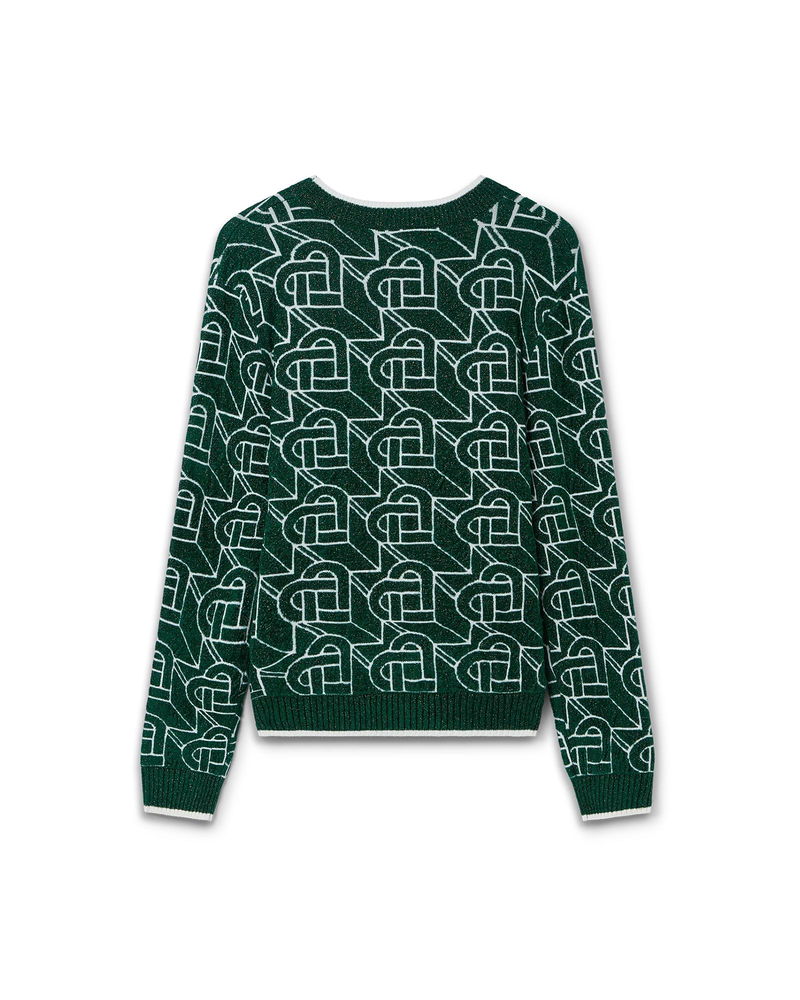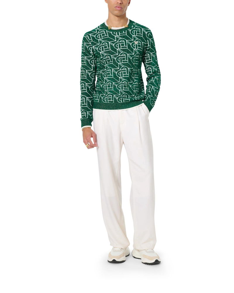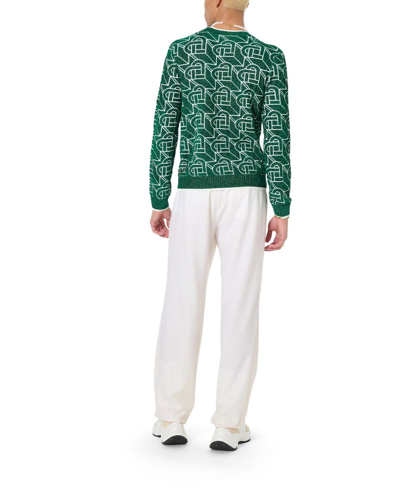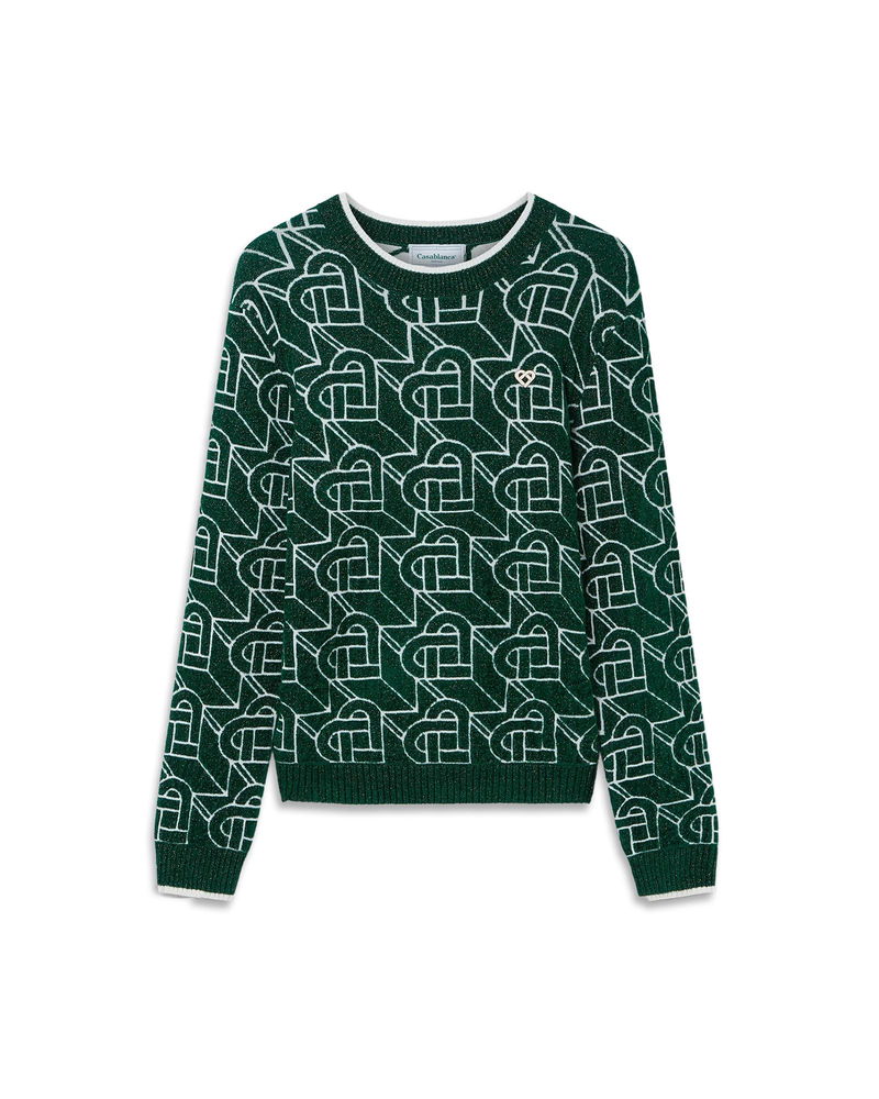 The heart monogram jumper is a long-sleeve knit style featuring the house's signature all-over heart monogram design with flecks of gold threads, complete with the house's enamel and gold-plated heart rivet, and a Casablanca branded label.55% viscose 45% nylon Colour: green Specialised dry clean only Fits true to size, take your regular size The model is 187cm/6'1 and is wearing a size M. Made in China Heart Monogram Jumper, Size XXXL by Casablanca Paris