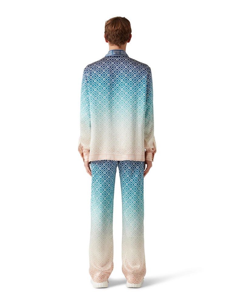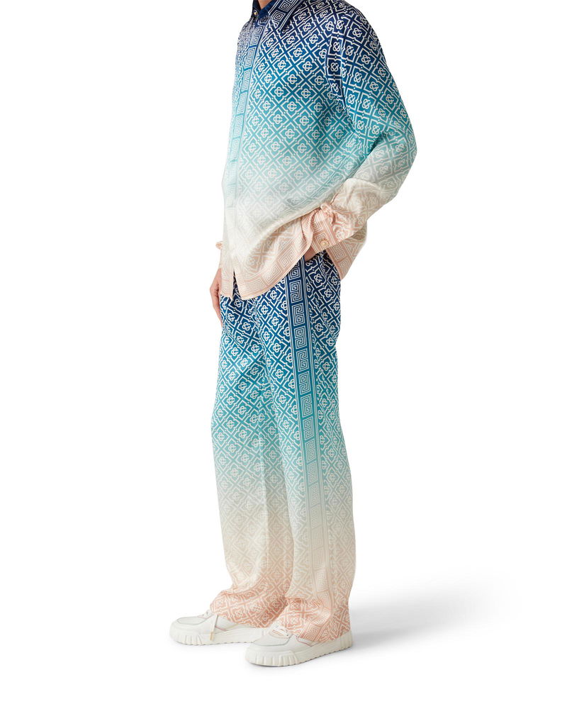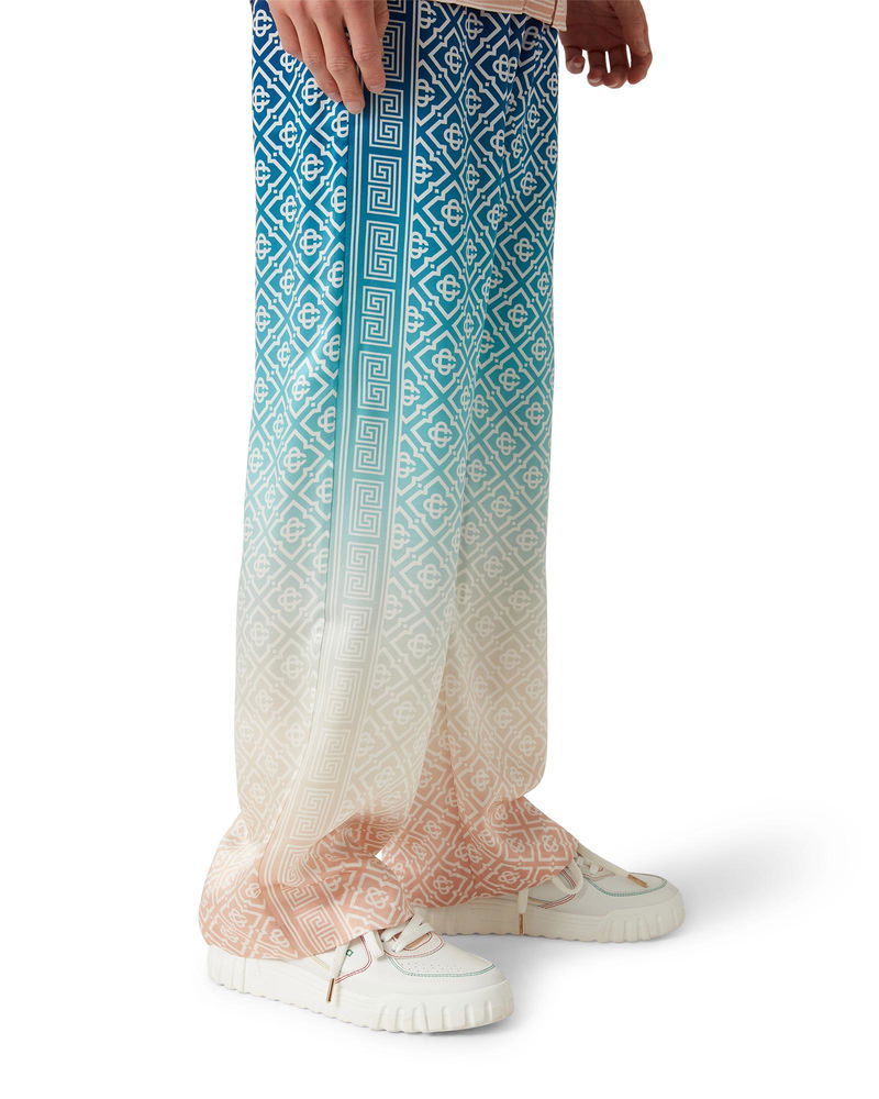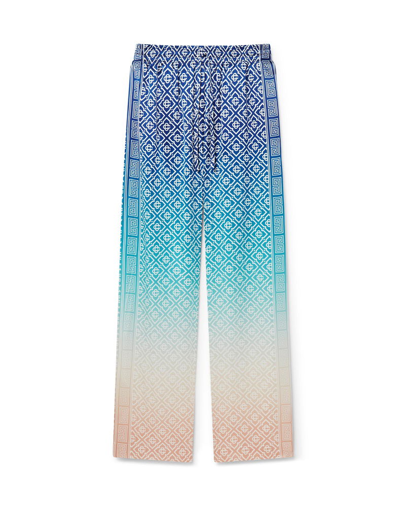 The jacquard gradient silk trousers are an all-over printed style in the house's signature monogram crafted from a silk satin fabric. Completed with an elasticated waistband, in-seam pockets, and a lining. Gradient silk satin fabric Main: 100% silk satin Lining: 100% polyester Colour: blue gradient multicolour Specialised dry clean only Made in Italy Fits true to size, take your regular size The model is 179cm/5'10.5 and is wearing a size S Jacquard Gradient Silk Trousers in Blue, Size Large by Casablanca Paris