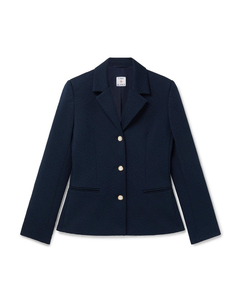 The jacquard knit single-breasted jacket is a classic tailored jacket crafted from a jacquard knit fabric featuring the house's signature diamond monogram. This jacket is completed with button closure, signature gold rim pearl buttons, front pockets, ribbed waist details.