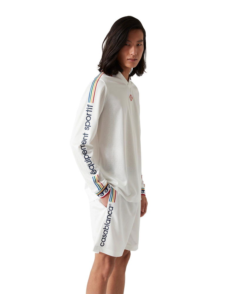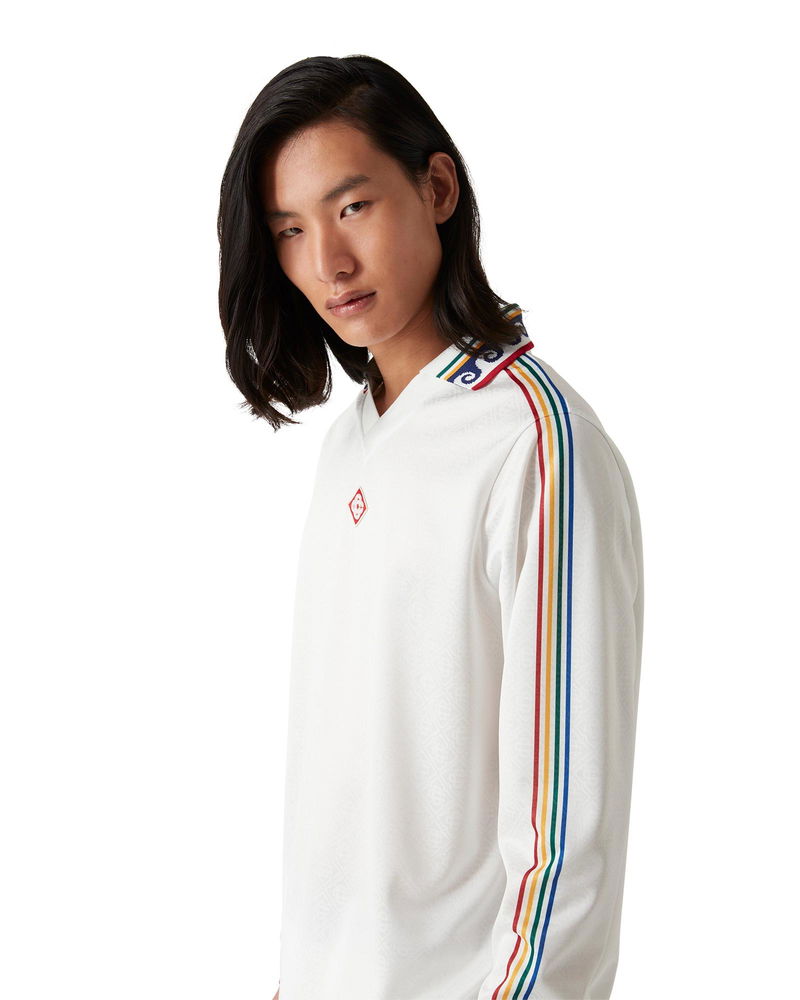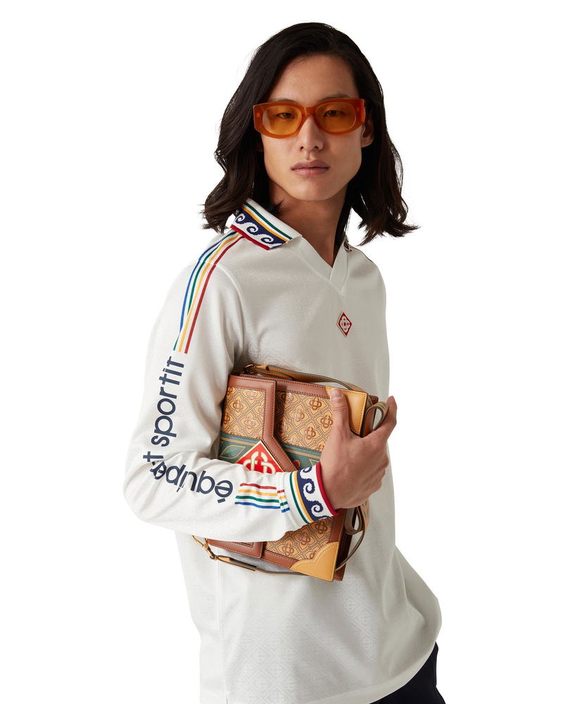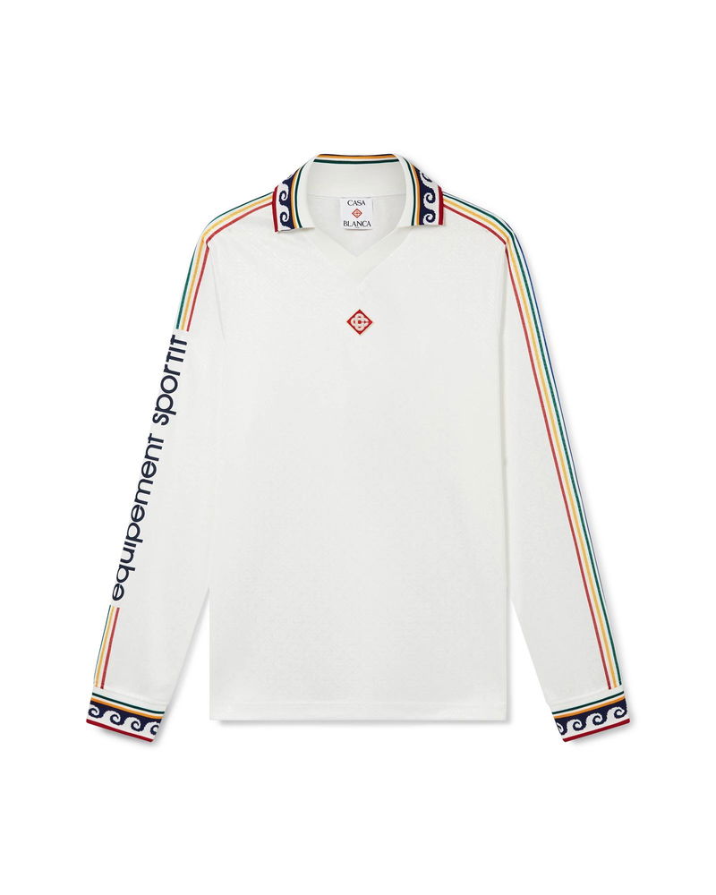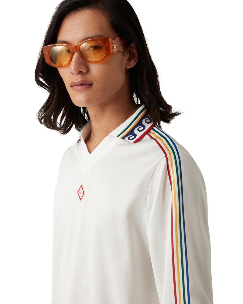 The jacquard monogram football shirt is a long-sleeve all-over print style featuring the house's interlocking CC monogram, crafted from a jacquard monogram fabric. Completed with a rib collar and cuffs, Casablanca branding down the sleeves, and a signature diamond logo at the collar. Jacquard monogram fabric Main: 100% polyester Contrast: 95% polyester 5% elastane Colour: white Specialised dry clean only Made in Portugal The model is 187cm/6'1 and is wearing a size M Jacquard Monogram Football Long Sleeve Shirt, Size XS by Casablanca Paris