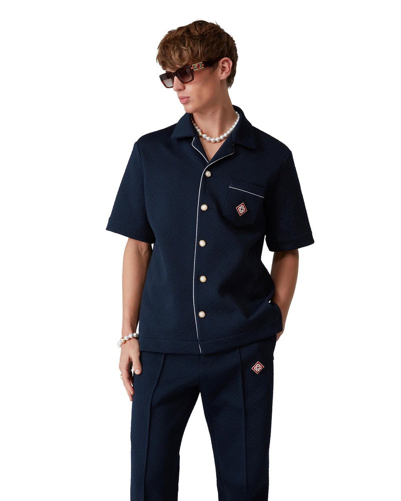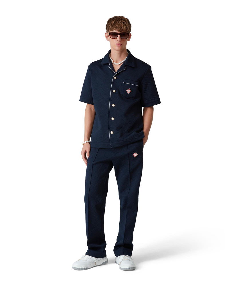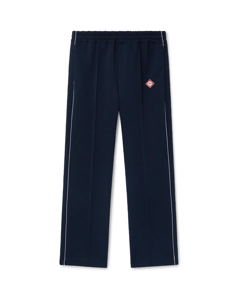 The jacquard monogram track pants are a straight-leg sportswear-inspired design crafted from a jacquard knit fabric. Completed with an elasticated waistband with drawstring fastening, side pockets, pin-tucked seams down the front, contrast piping detail down the sides, and the house's signature diamond logo. Jacquard knit fabric Main: 65% polyester 18% polyamid 17% cotton Lining: 100% polyester Contrast: 100% polyester Applique: 95% viscose 5% polyester Colour: navy Delicate machine wash Made in Lithuania Model is 186cm/6'1 and is wearing a size M Jacquard Monogram Track Pants, Size Small by Casablanca Paris