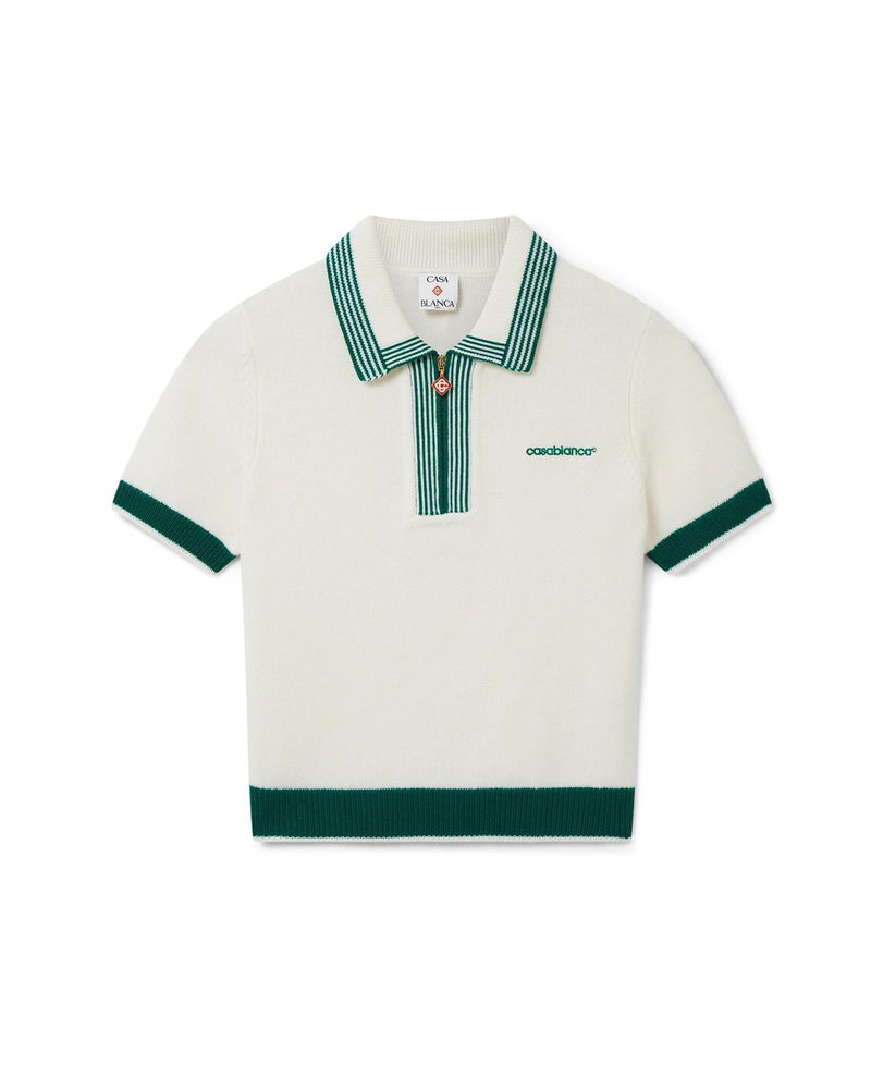 The knit tennis polo shirt is a classic design crafted from a merino wool fabric. Completed with contrast ribbed edge detail on the cuffs, hem, collar and placket, front zip closure, a rib collar and Casablanca logo.