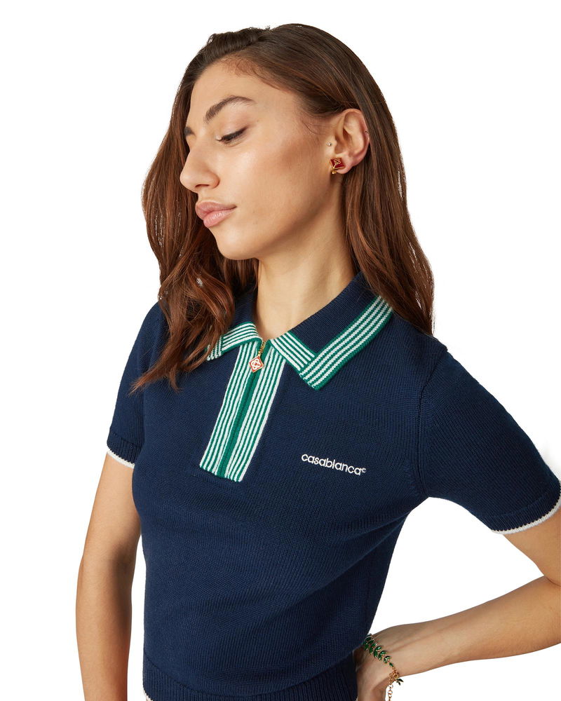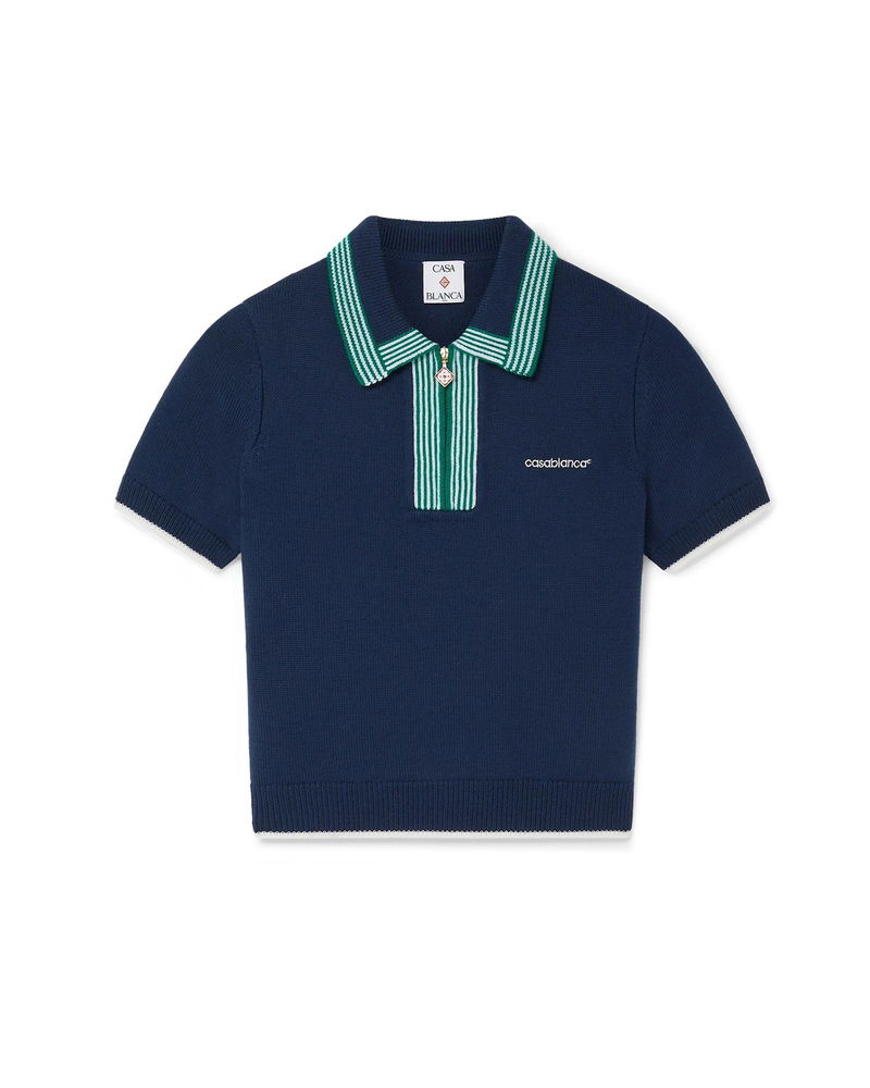 The knit tennis polo shirt is a classic design crafted from a merino wool fabric. Completed with contrast ribbed edge detail on the cuffs, hem, collar and placket, front zip closure, a rib collar and Casablanca logo.
