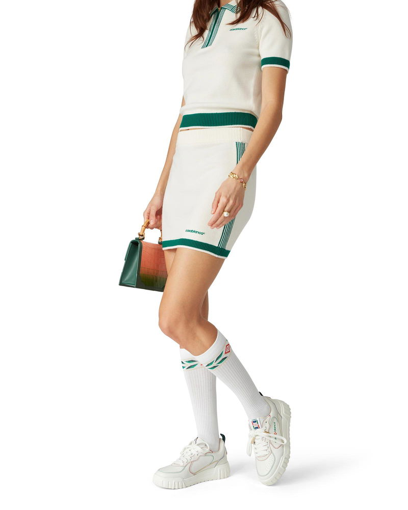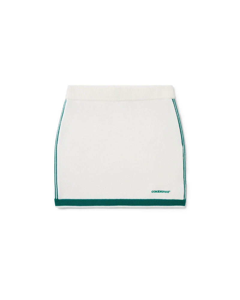The knit tennis skirt is a fitted mini-skirt design crafted from a merino wool fabric. Completed with an elasticated waistband, contrast edge detail on the hem, stripe detail down the sides, and the Casablanca logo.