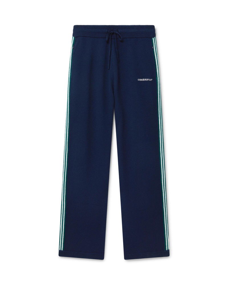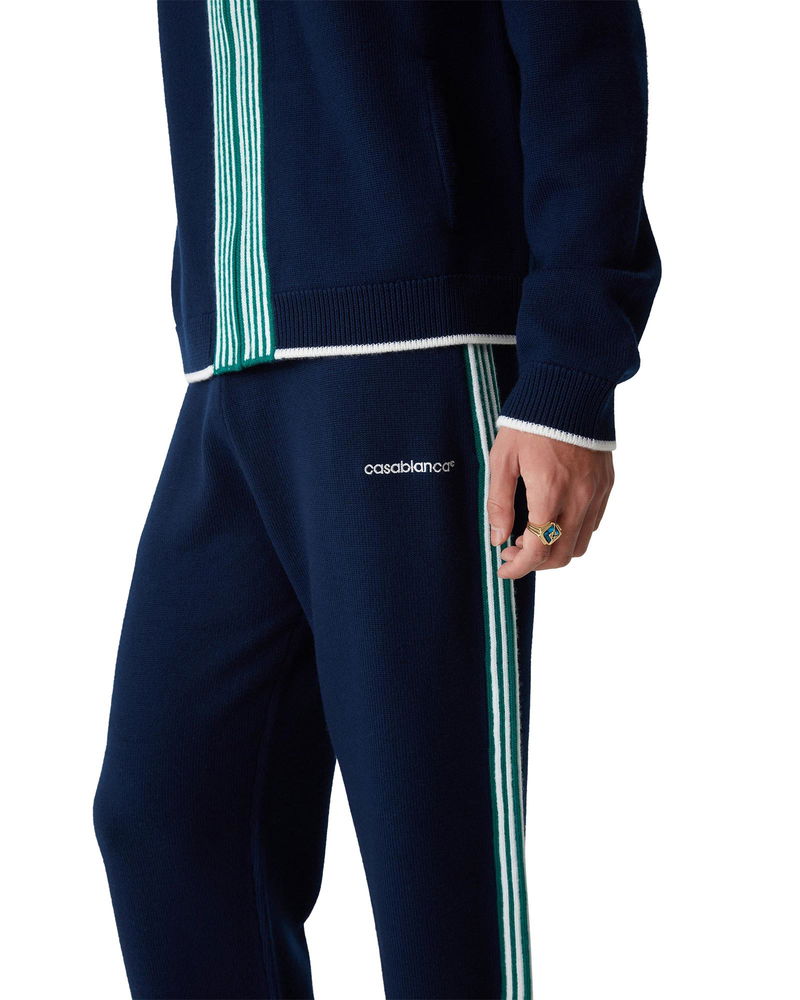 The knit tennis trousers have a sportswear-inspired design crafted from merino wool fabric. Completed with contrast ribbed edge detail on the cuffs, hem, collar and placket, front zip closure, a funnel collar and Casablanca logo. Merino wool fabric 100% merino wool Embroidery: 100% polyester Colour: navy Specialised dry clean only The model is 187cm/6'1 and is wearing a size M Made in China Knit Tennis Trousers, Size Medium by Casablanca Paris