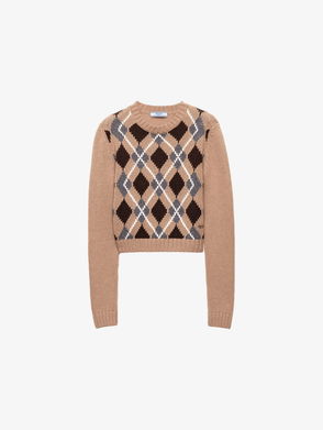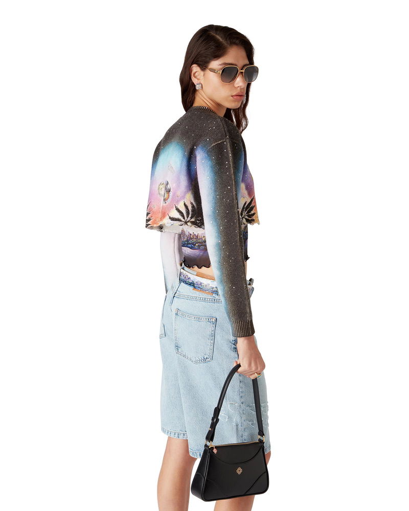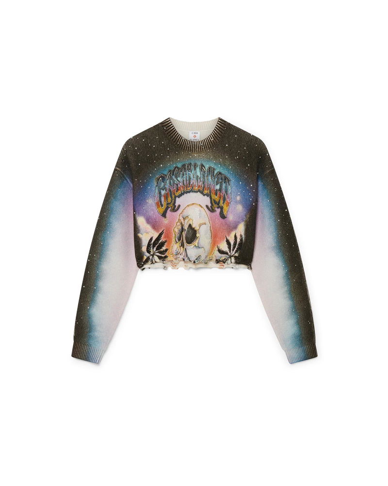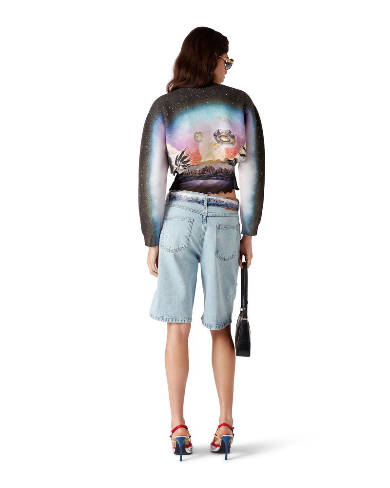 The La Prémonition cashmere blend cropped jumper is a long-sleeve short-style crafted from a printed wool fabric featuring the season's artwork, inspired by an eery vision of the skyline of LA at night, with UFO elements touching on vintage sci-fi inspiration.