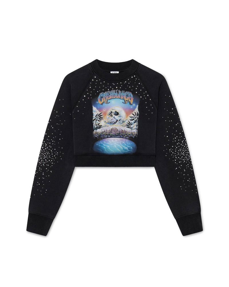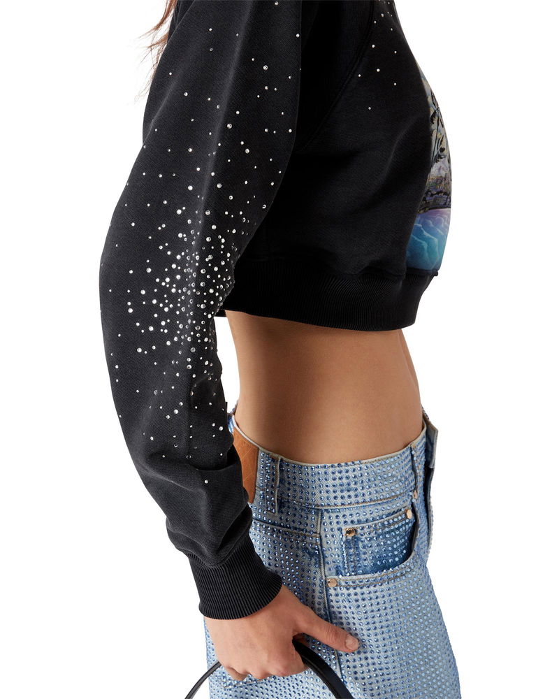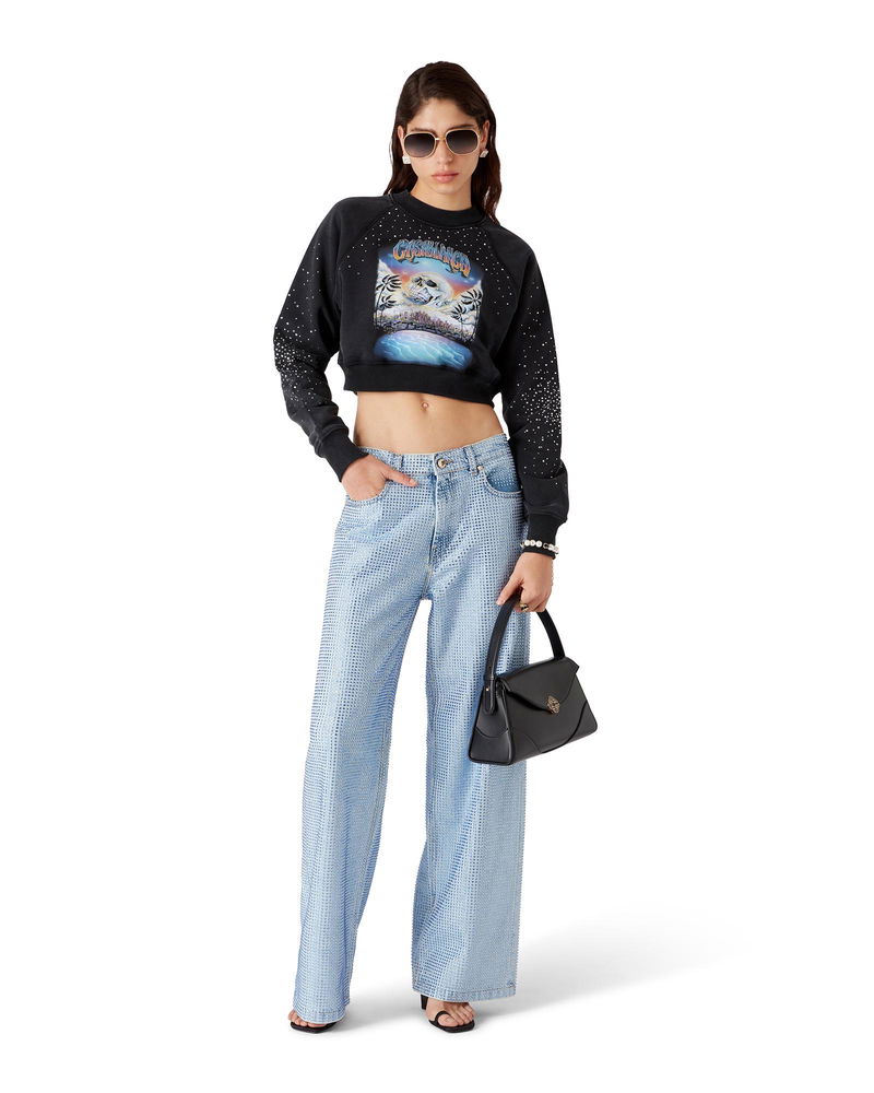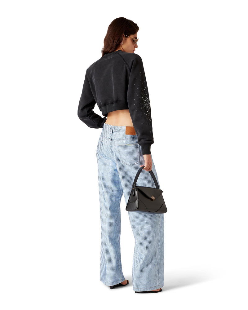 The La Prémonition crystal embellished denim shorts are a knee-length design with a relaxed silhouette crafted from denim fabric and all-over hotfix glass beading. Completed with a lining, front and back pockets, zip closure, and belt loops.