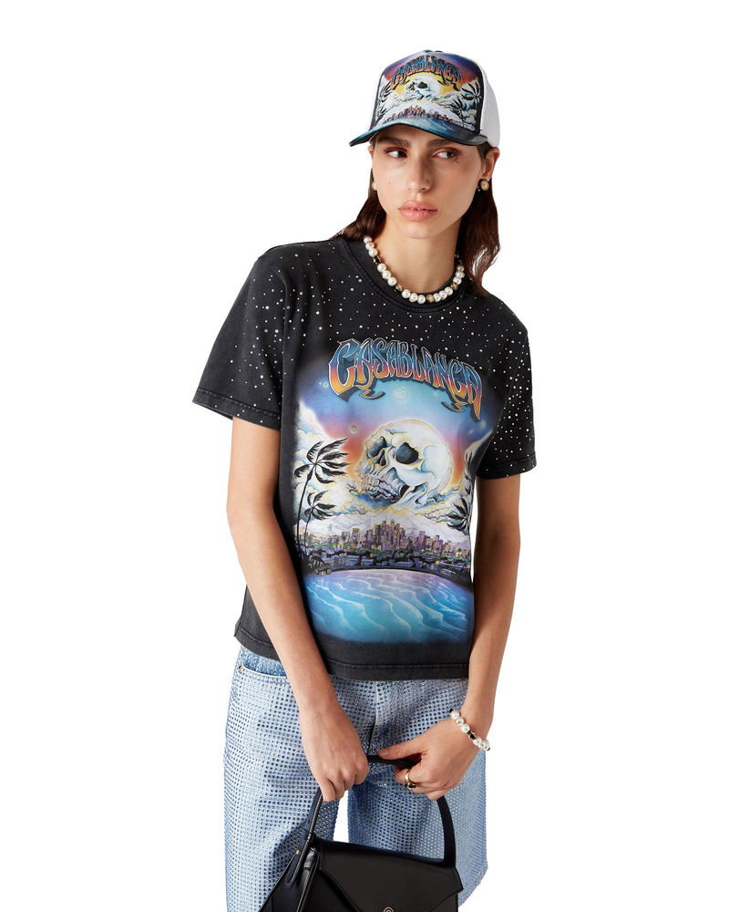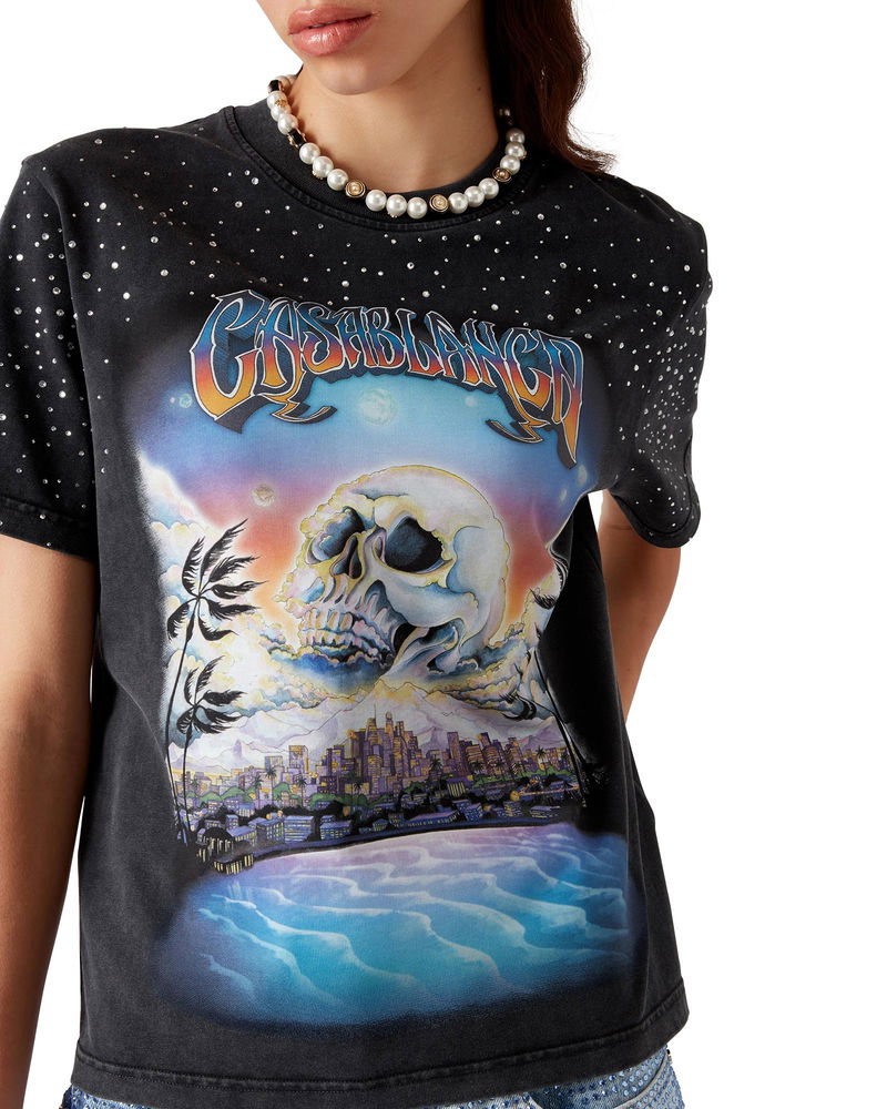 The La Prémonition crystal embellished t-shirt is a short-sleeve design crafted from a printed organic cotton fabric featuring the season's artwork, inspired by an eerie vision of the skyline of LA at night, with UFO elements touching on vintage sci-fi inspiration.