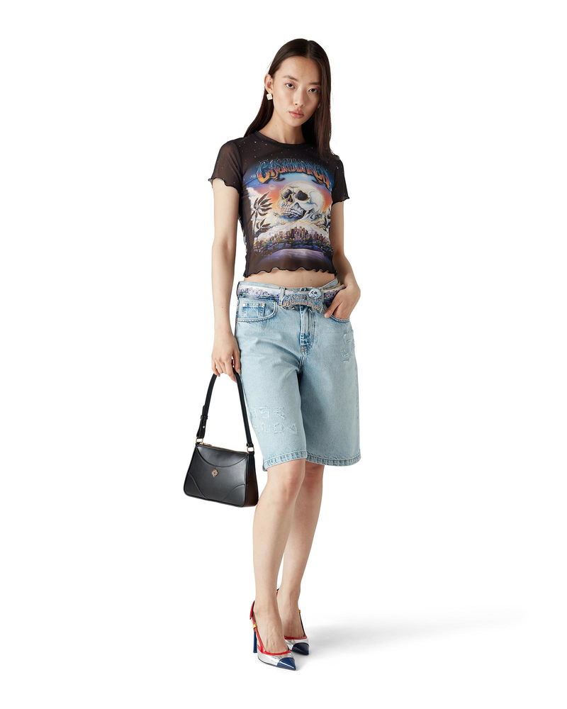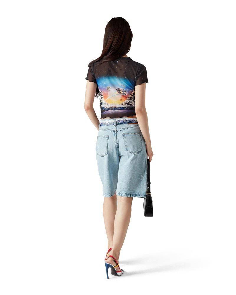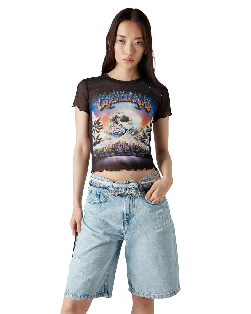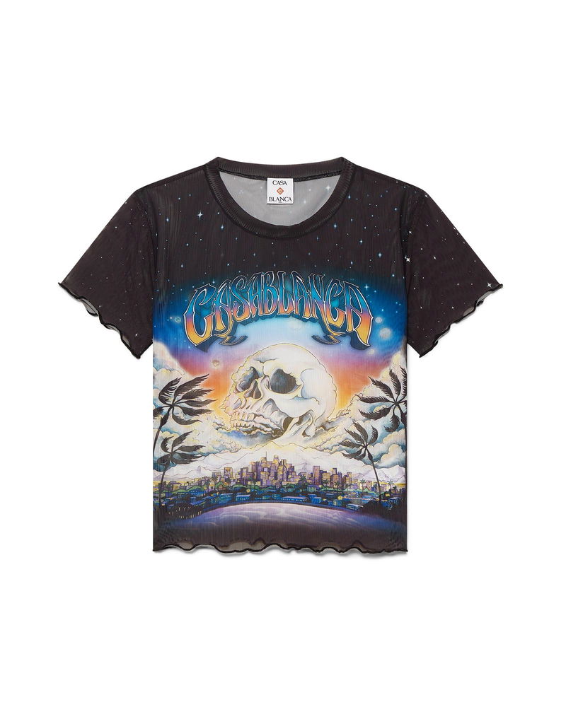 The La Prémonition mesh t-shirt is a short-sleeve printed design crafted from mesh fabric featuring signature artwork inspired by an eerie vision of the skyline of LA at night, with UFO elements touching on vintage sci-fi inspiration. Completed with a classic crew neck and frill edge detail on the sleeves and hem.