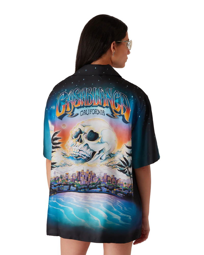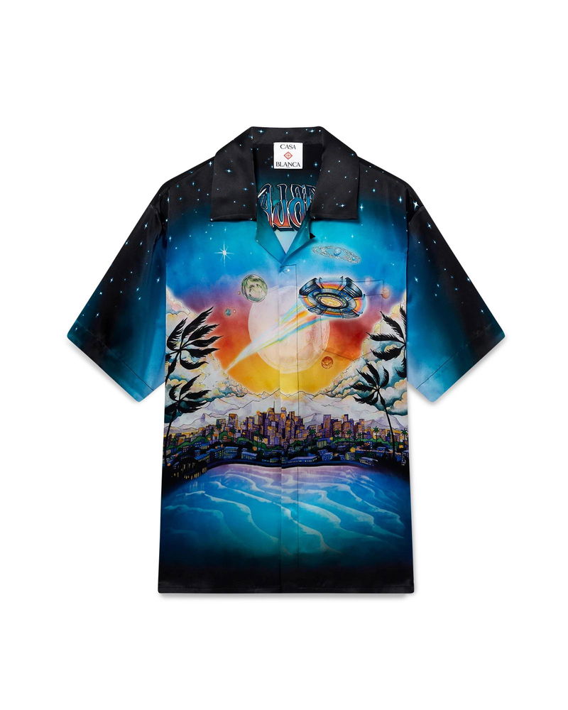 The La Prémonition silk shirt is a short-sleeve printed design, featuring artwork inspired by an eerie vision of the skyline of LA at night, with UFO elements touching on vintage sci-fi inspiration.