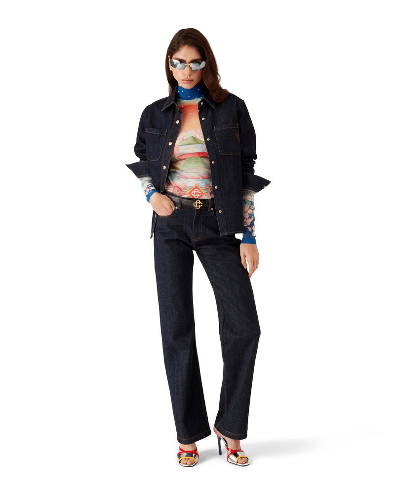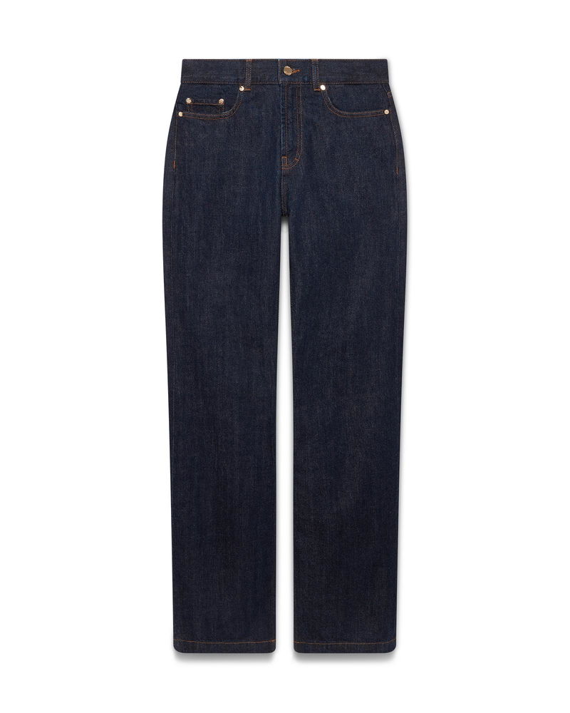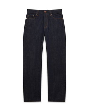 The raw denim selvedge jeans are a straight-leg design crafted from cotton denim fabric. Finished with embroidered interlocking CC logo, belt loops, front and back pockets, gold-plated branded hardware, and a zip closure. Intended to be worn with its coordinating shirt - designed for a slim fit.