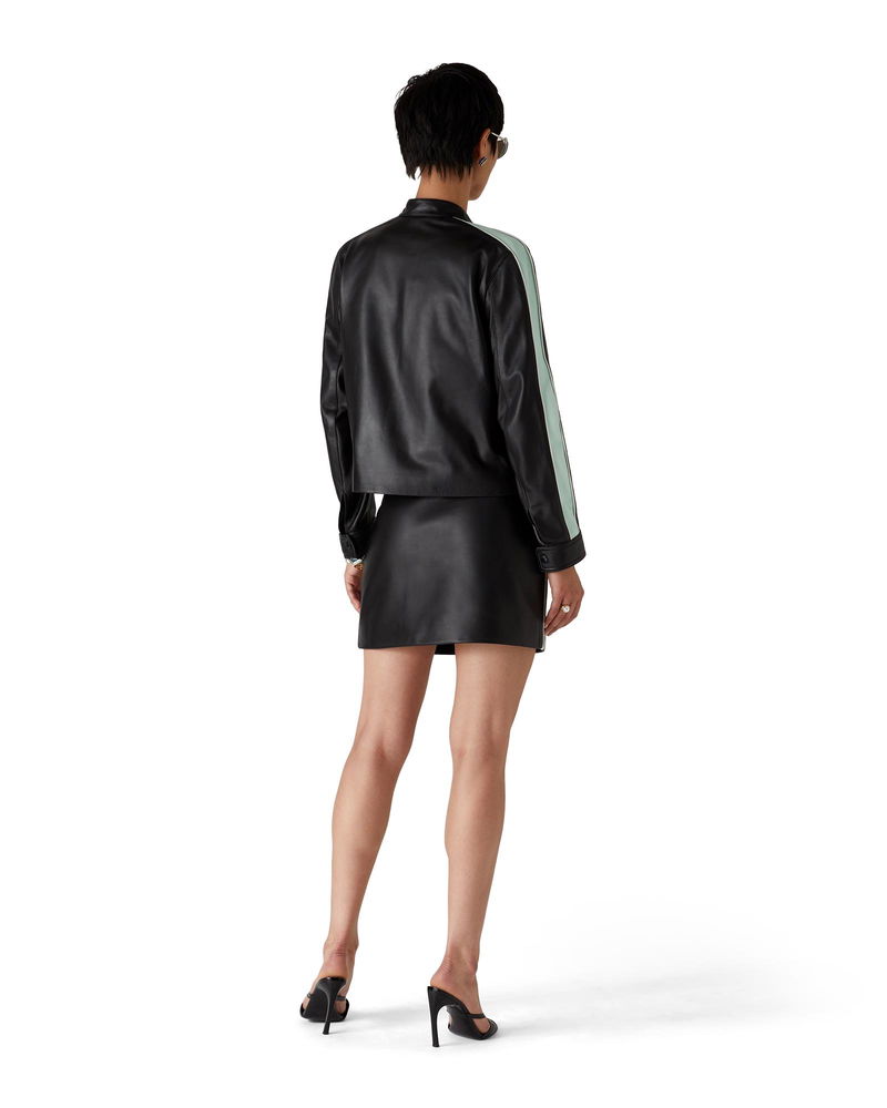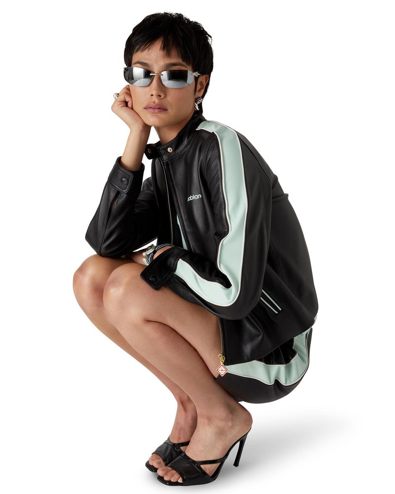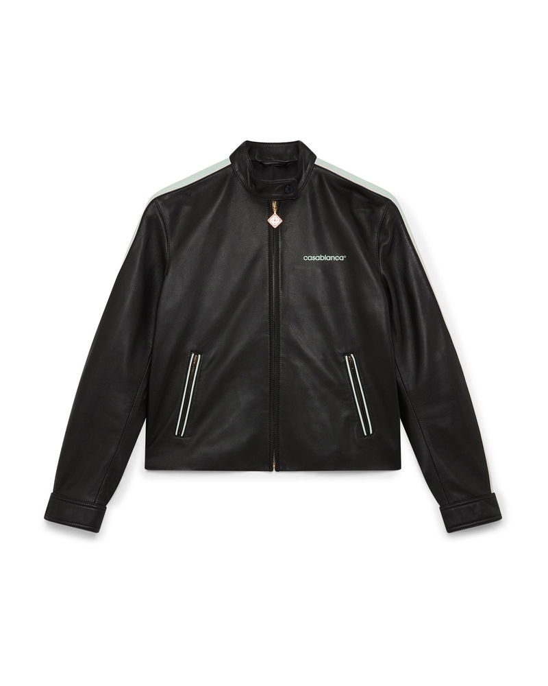The leather racer jacket is a slim-fit sportswear design crafted from lamb nappa fabric. Completed with a zip closure, slanted front pockets with zip closures, stripe detail down the sleeves, and the house's Casablanca logo.