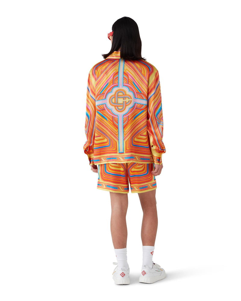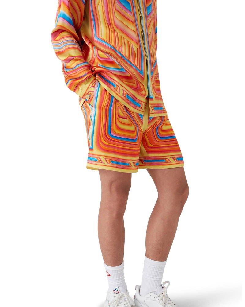 The Low Rider silk shorts are an all-over printed design crafted from a silk satin fabric featuring the house's seasonal artwork referencing the pop colours and airbrushing painting techniques used on low-rider cars, with the Casablanca logo. Completed with an elasticated waistband, in-seam side pockets, a back patch pocket, drawstring fastening, and a lining. Silk satin fabric Main: 100% silk Lining: 100% polyester Low Rider multicolour print Specialised dry clean only Made in Italy The model is 187cm/6'1 and is wearing a size M Low Rider Silk Shorts, Size Small by Casablanca Paris