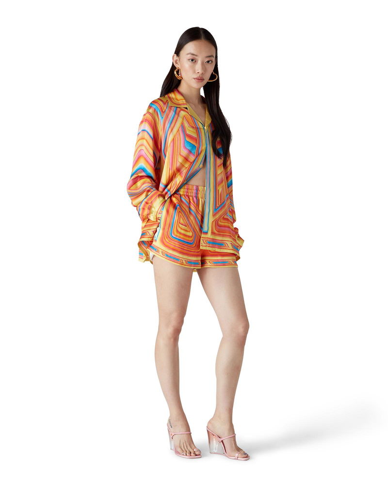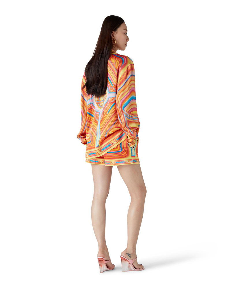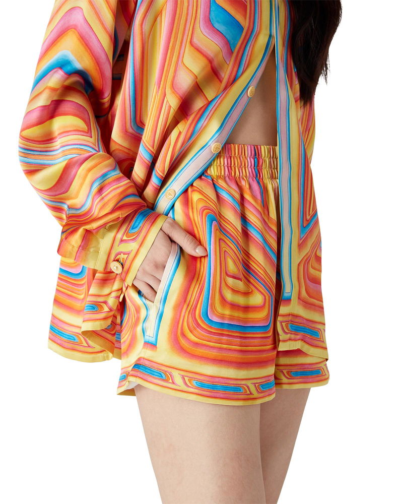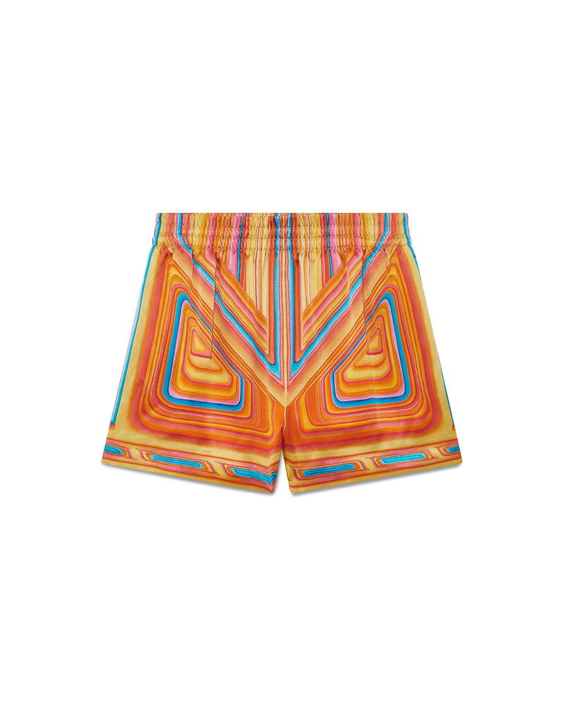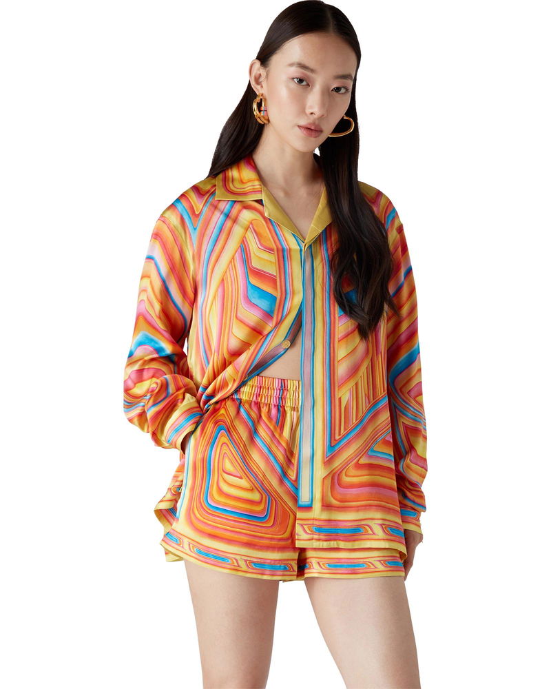 The Low Rider silk shorts are an all-over printed design crafted from a silk satin fabric featuring the house's seasonal artwork referencing the pop colours and airbrushing painting techniques used on low rider cars, with the Casablanca logo.