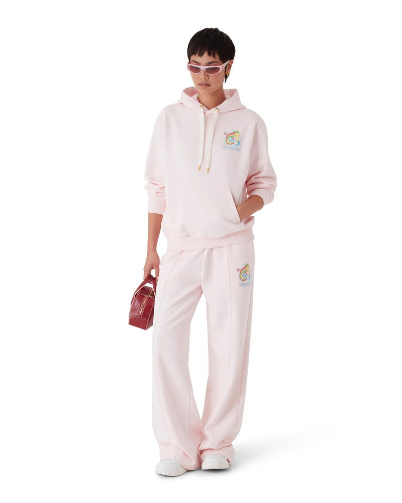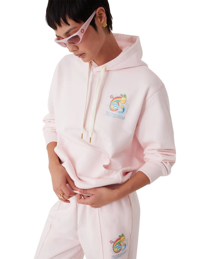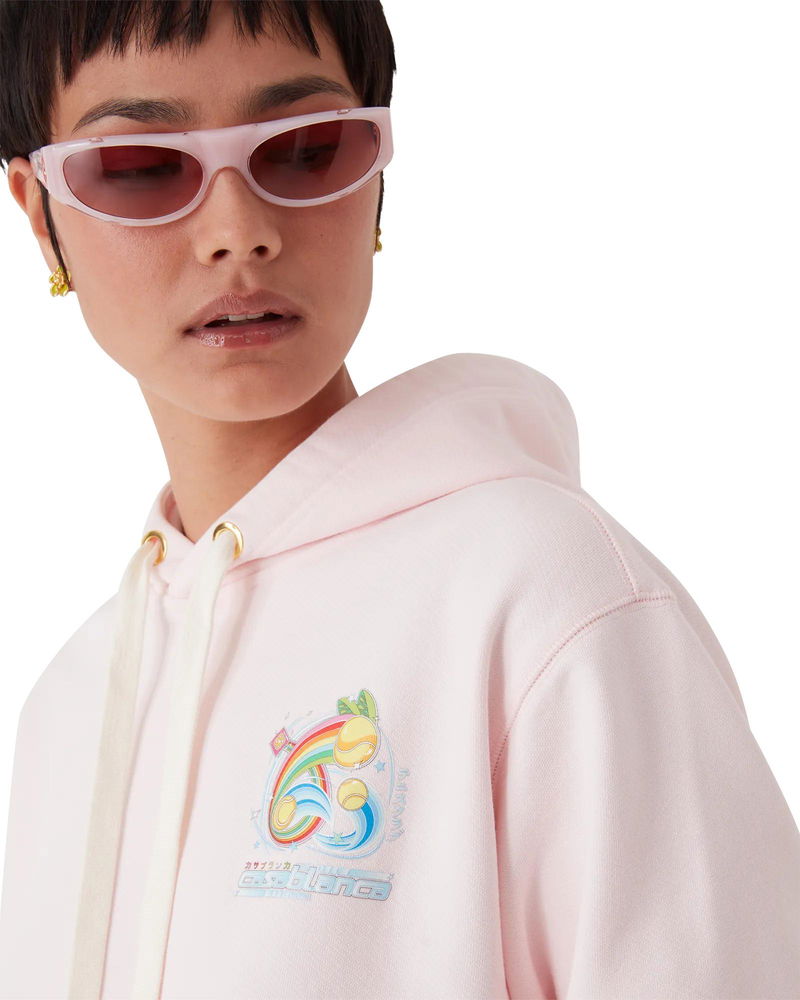 The Manga Tennis Ball hoodie is a long-sleeve, embroidered sportswear design featuring the season's artwork exploring the world of Kawaii and Manga, playing with Casablanca's iconography, using tennis balls as oranges for a fun twist. Completed with a hood, drawstring fastening, a kangaroo pocket, and rib cuffs and hem detail.