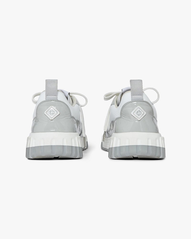 The men's Court silver sneaker is a refined design crafted from leather, featuring the house's warped logo on the side, reflecting the house's elevated approach to tennis-inspired footwear with a classic Court silhouette. Completed with Casablanca branding on the back and a rubberised sole. Leather upper Casablanca logo on heel Woven Court tongue label Colour: silver/white Made in Portugal Fits true to size Men's Court Silver Sneakers, Size 7(US7.5) by Casablanca Paris