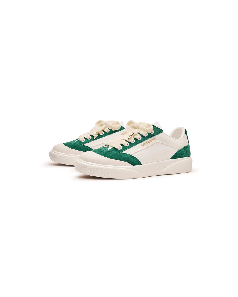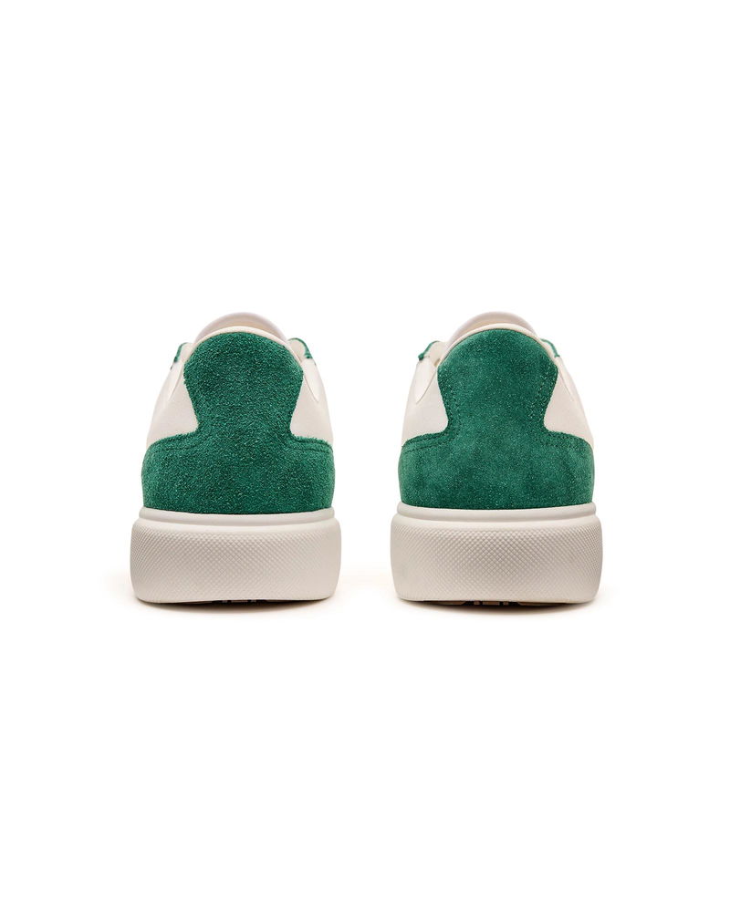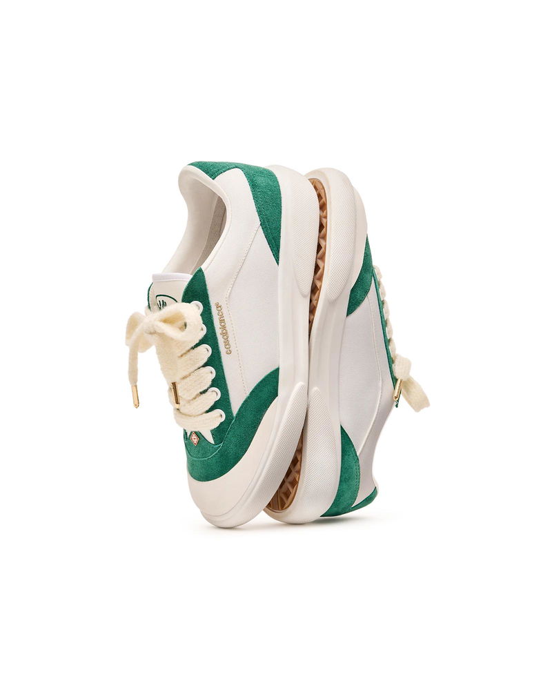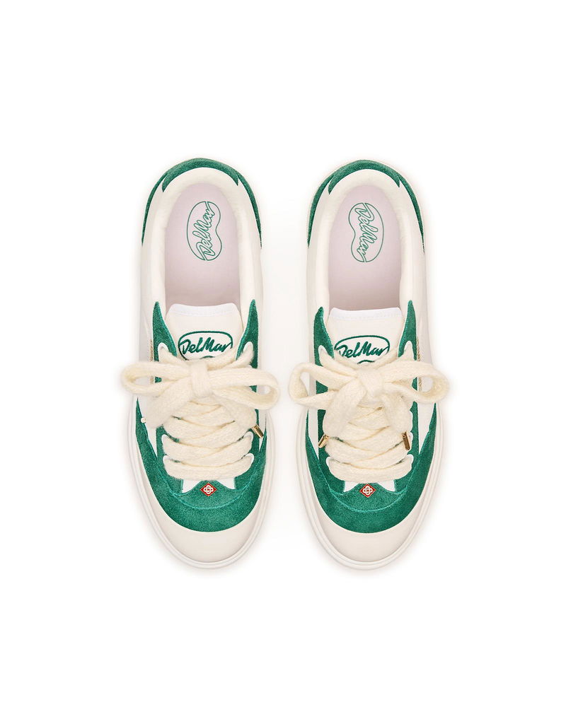 The Men's Del Mar white and green sneaker takes its name from the famous 1980s skatepark in California. The Del Mar sneakers are themed around classic late 70s to early 80s skate shoes. They feature a lot of the codes of the early skate shoes with canvas panelled uppers, rubber toe caps, flat sole and chunky laces, contrast eyelets and subtle branding. The green colourway is classic Casablanca brand colour. Tonal white/green leather upper Branded Casablanca diamond rubber patch on the heel Silicon Casablanca Sport branding on lateral side Woven Court tongue label Tennis Court inspired outsole realised in tennis-inspired primary colours Gold lace tips Fits true to size Men's Del Mar White & Green Sneaker, Size UK7.5/US8 by Casablanca Paris