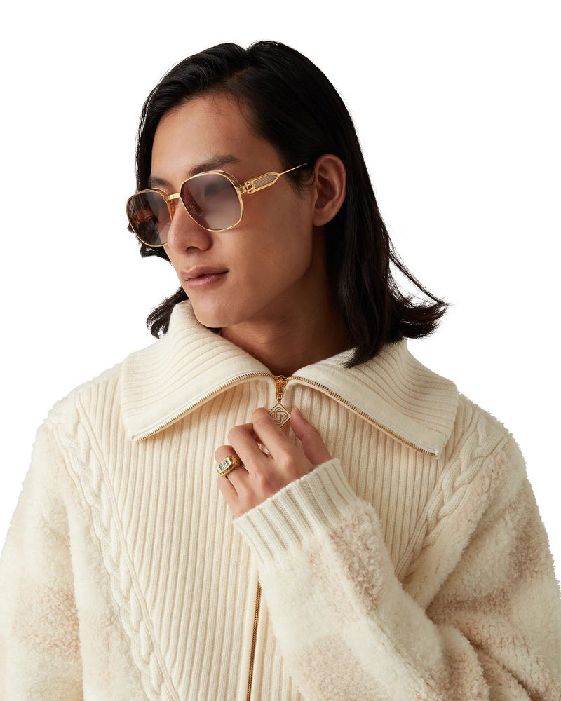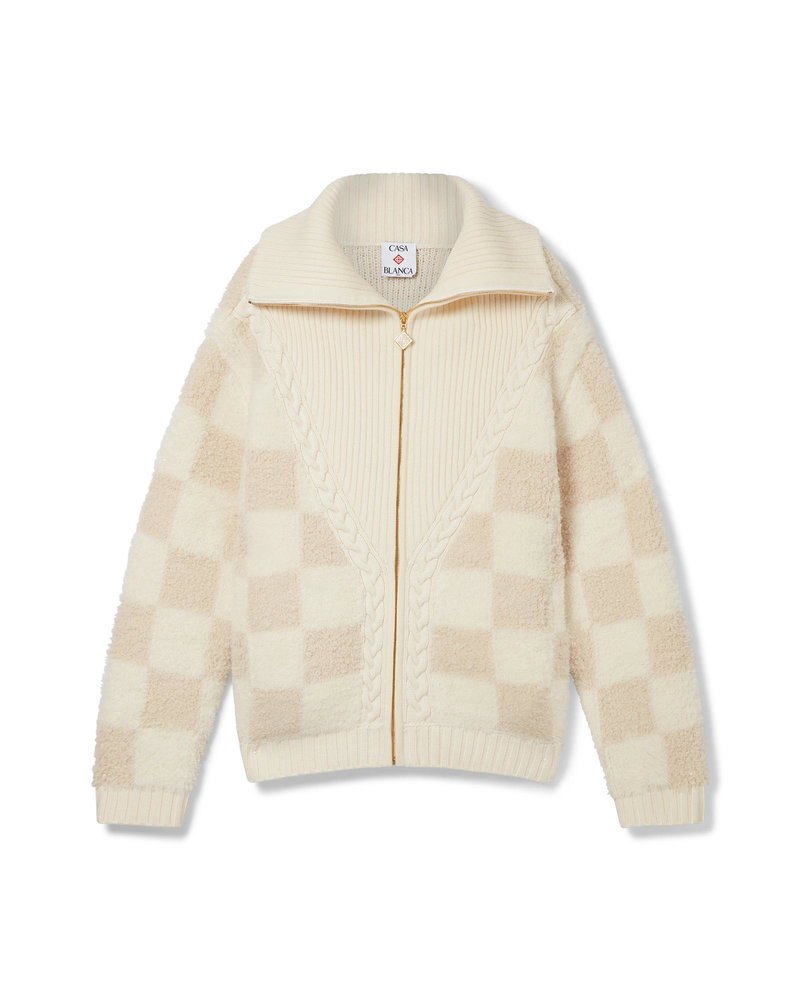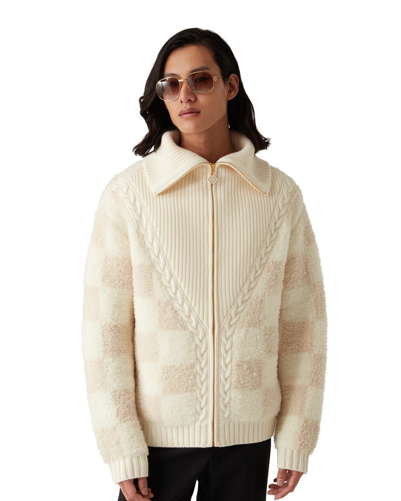 The Merino fleece jacket is a long-sleeved knitted design crafted from merino wool fabric featuring a checkered pattern. Completed with a zip closure, a rib v-shaped panel, collar, cuffs and hem Merino wool fabric Main: 92% merino wool 7% polyamide 1% elastane Colour: white Specialised dry clean only Fits true to size, take your regular size The model is 187cm/6'1 and is wearing a size M Made in China Merino Fleece Jacket, Size Small by Casablanca Paris