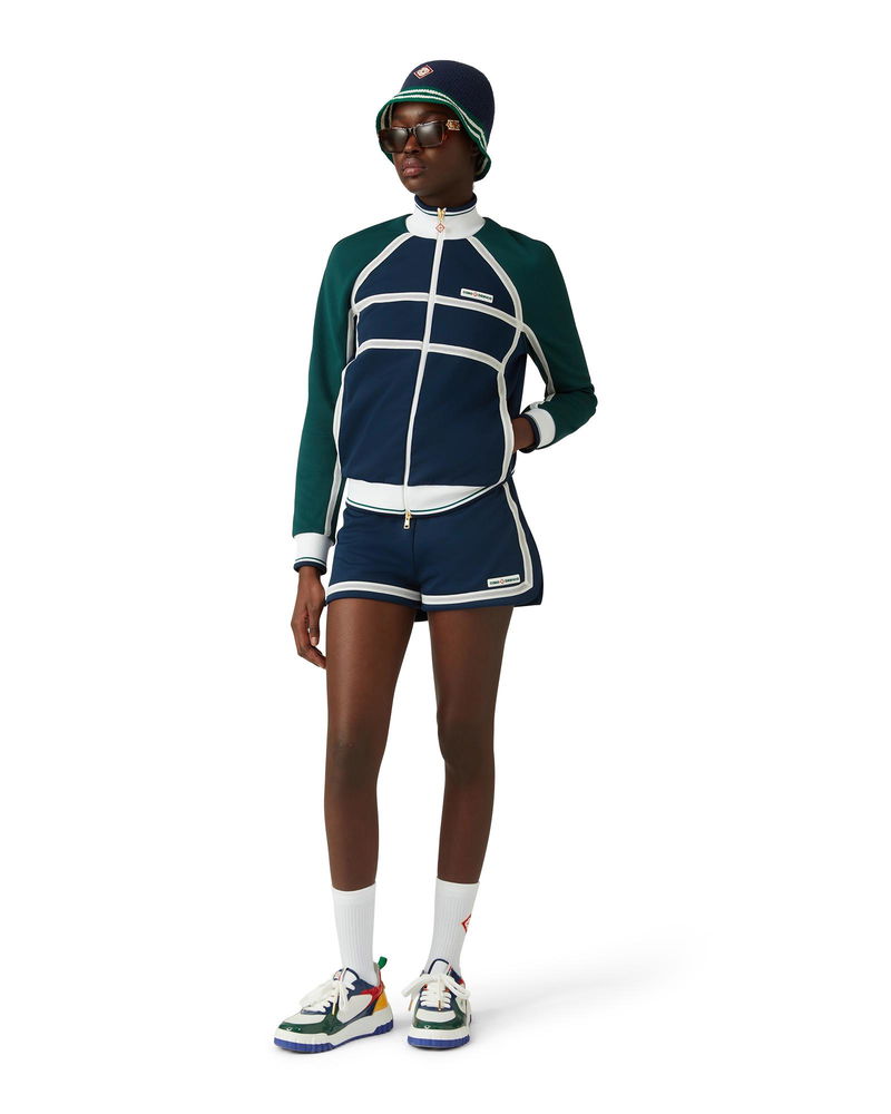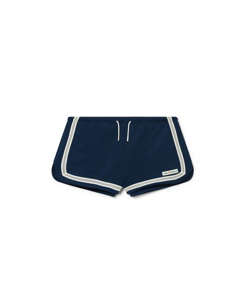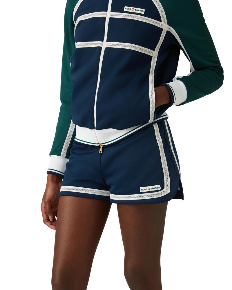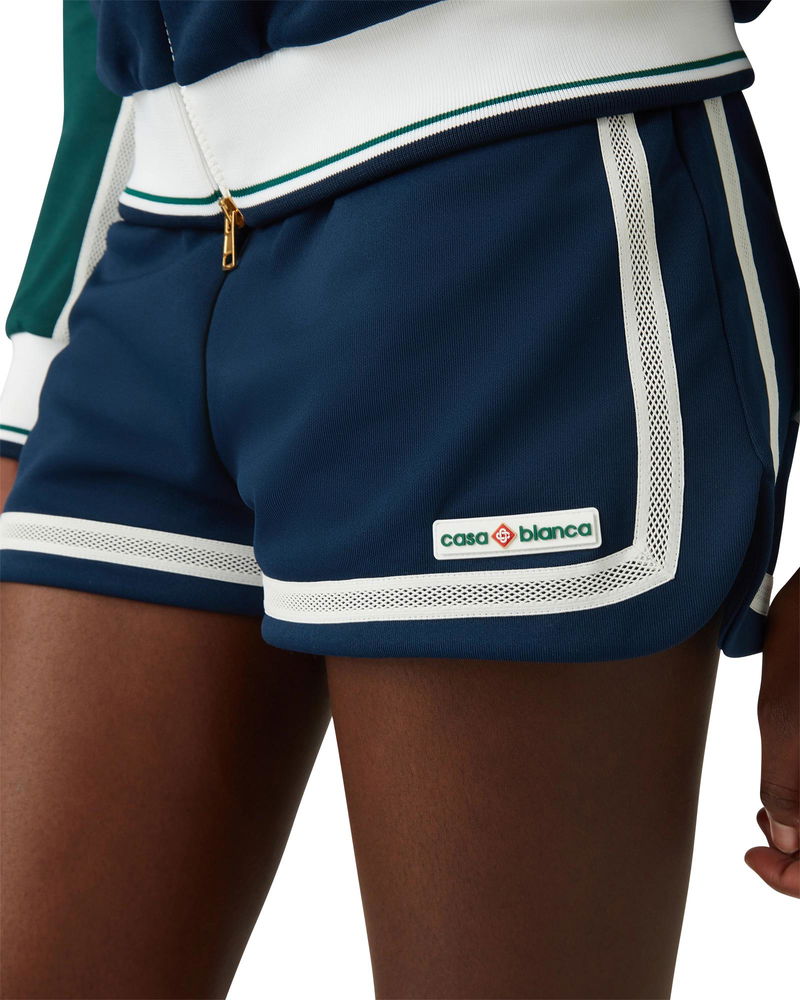 The mesh tape running shorts are a sportswear-inspired design crafted from a tricot fabric. Completed with an elasticated waistband, drawstring fastening, white piping details, mesh tape detail, and the house's signature Casablanca logo.