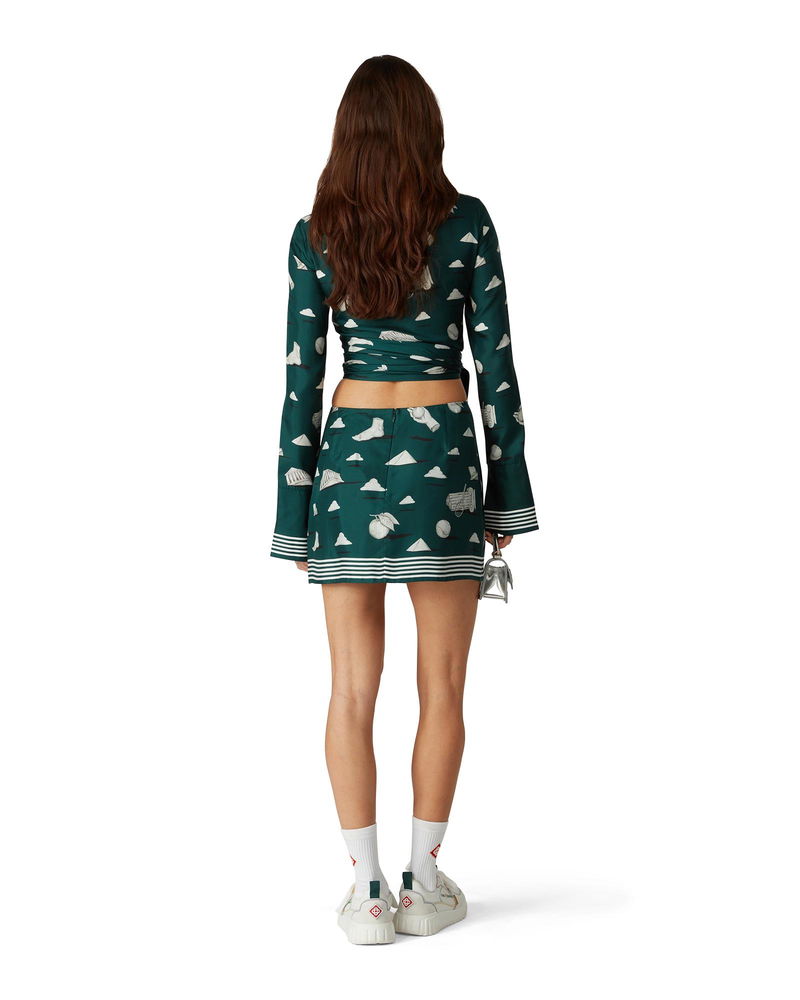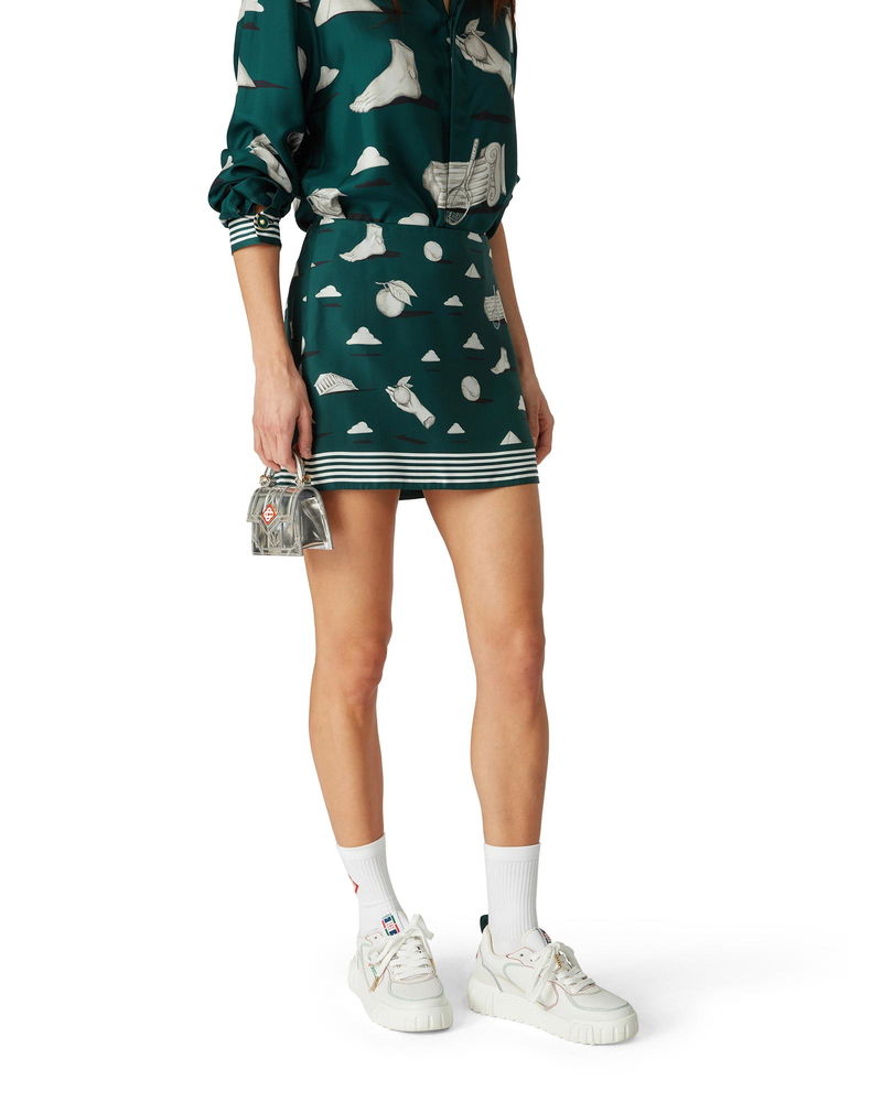 The Metaphysical mini silk skirt is an all-over printed design, crafted from silk twill fabric, featuring repeat trompe l'oeil artwork of the stone effect with the light drawing of core design elements.