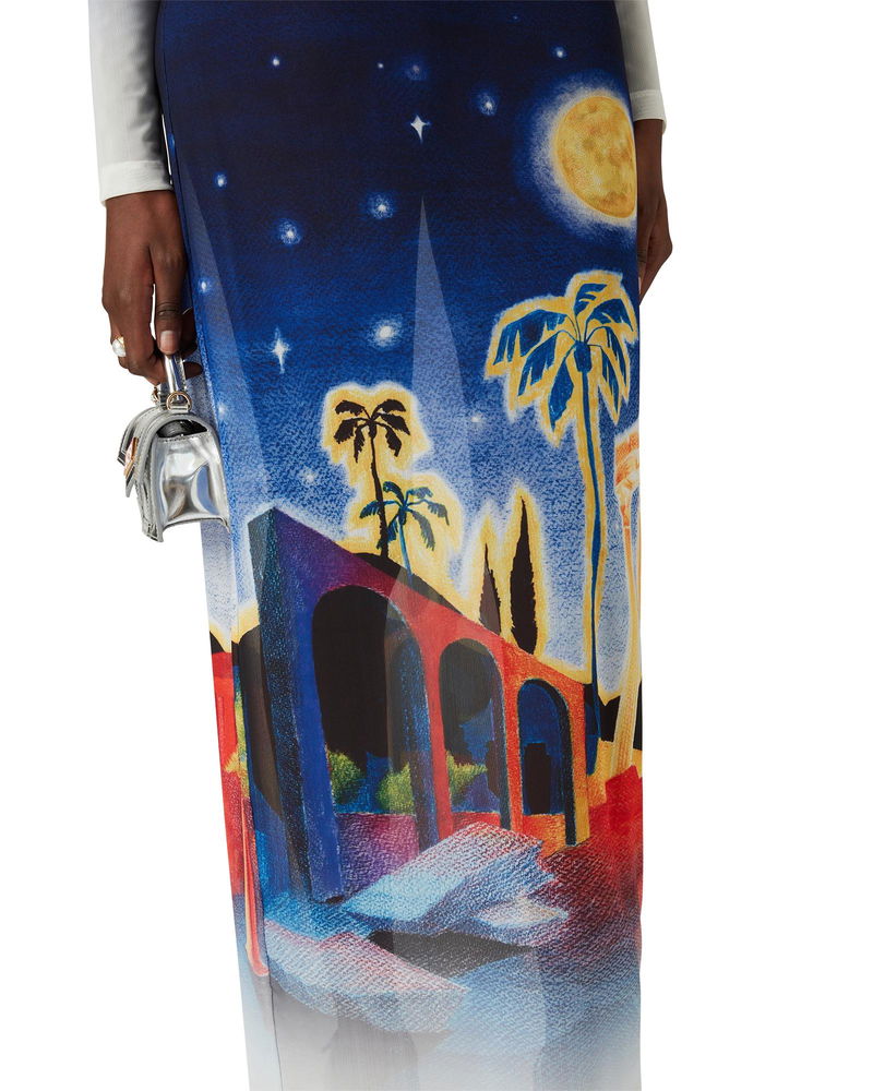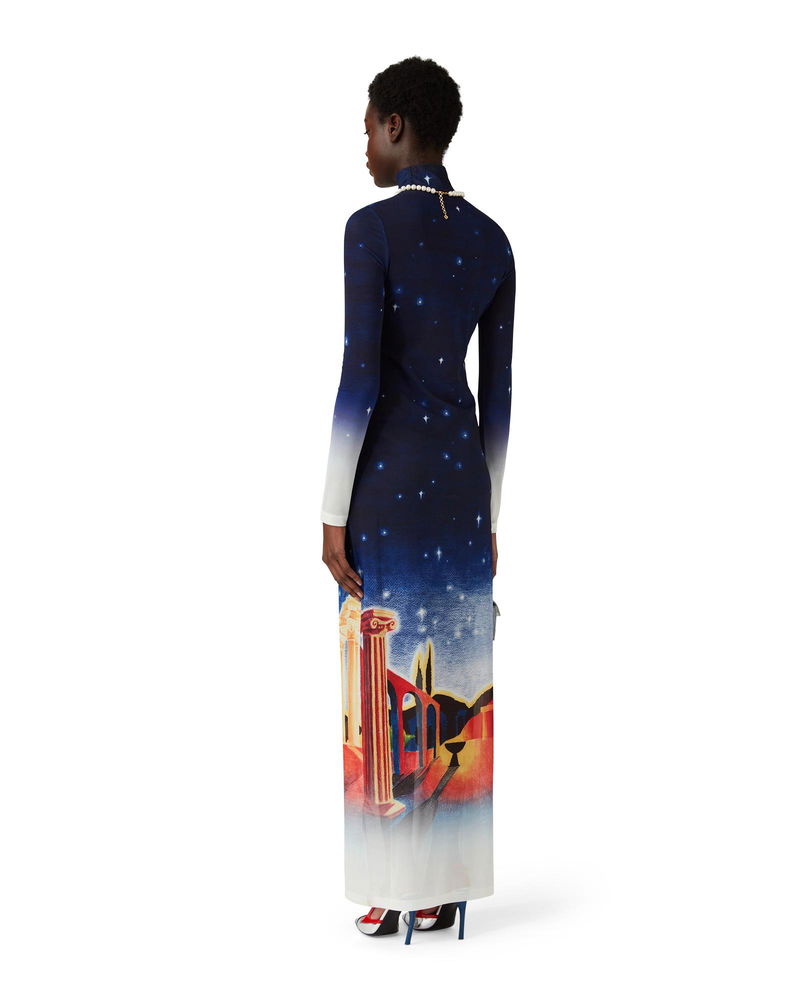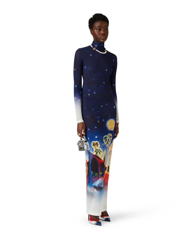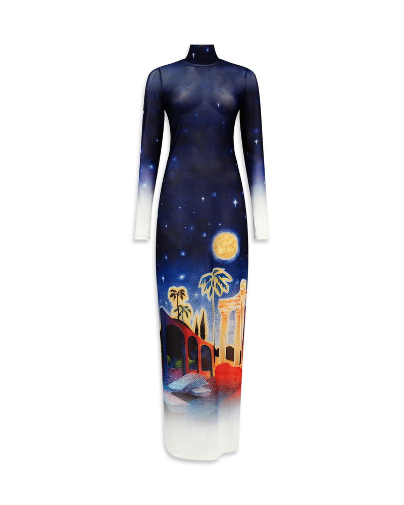 The Midnight Acropolis mesh dress is a long-sleeved all-over printed design crafted from stretch mesh fabric featuring the house's seasonal print, paying homage to the beautiful night of Ancient Greece with the light from the temple and sky Completed with a classic polo neck. Printed stretch mesh fabric.