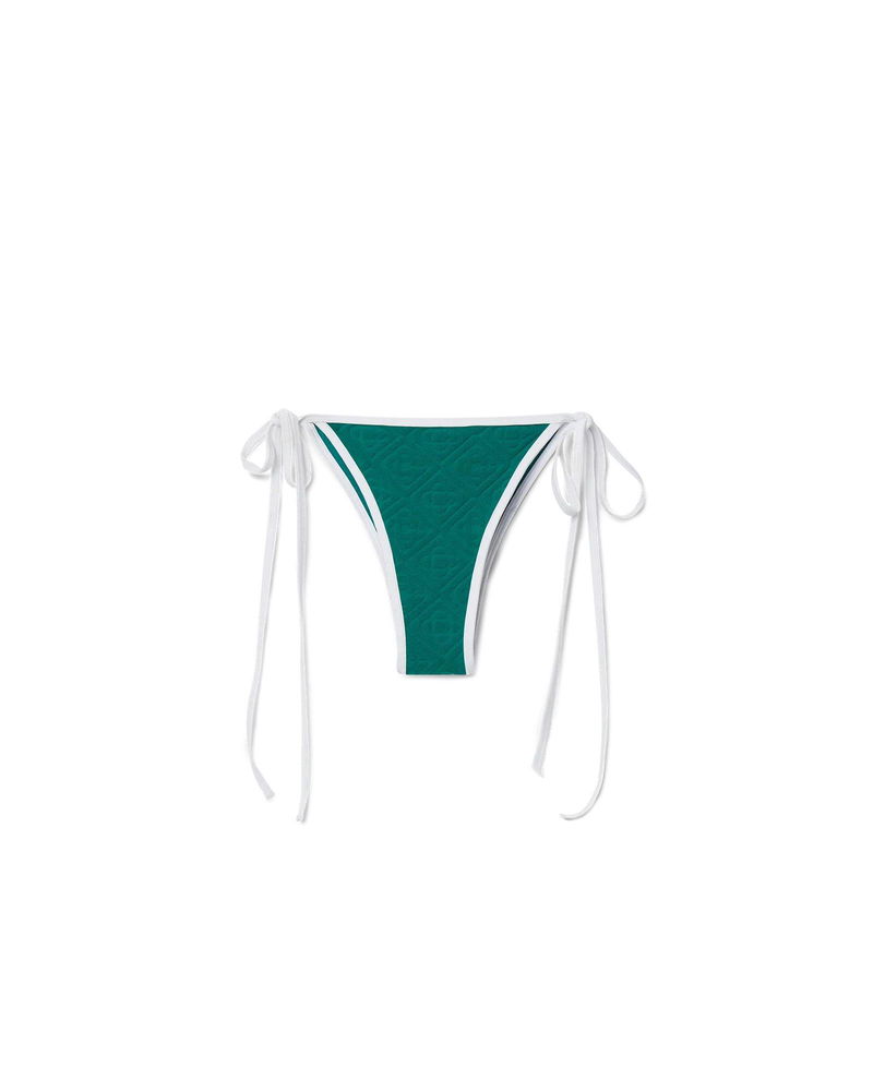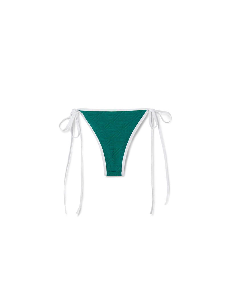 The green monogram bikini bottom fastens at the hip with white contrast strings.