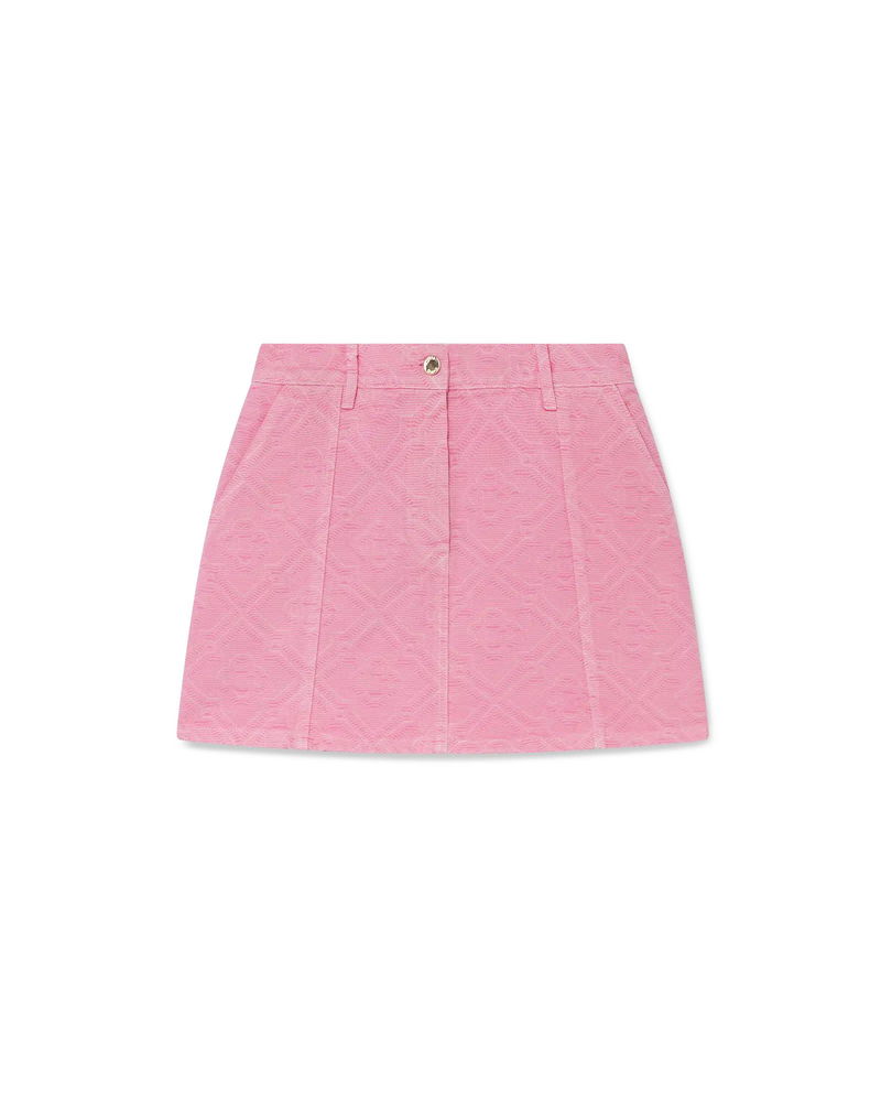 The monogram denim skirt is a mini A-line design featuring the house's signature monogram pattern.