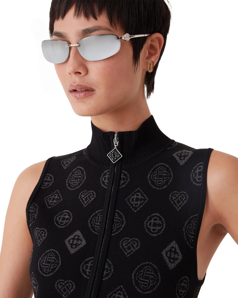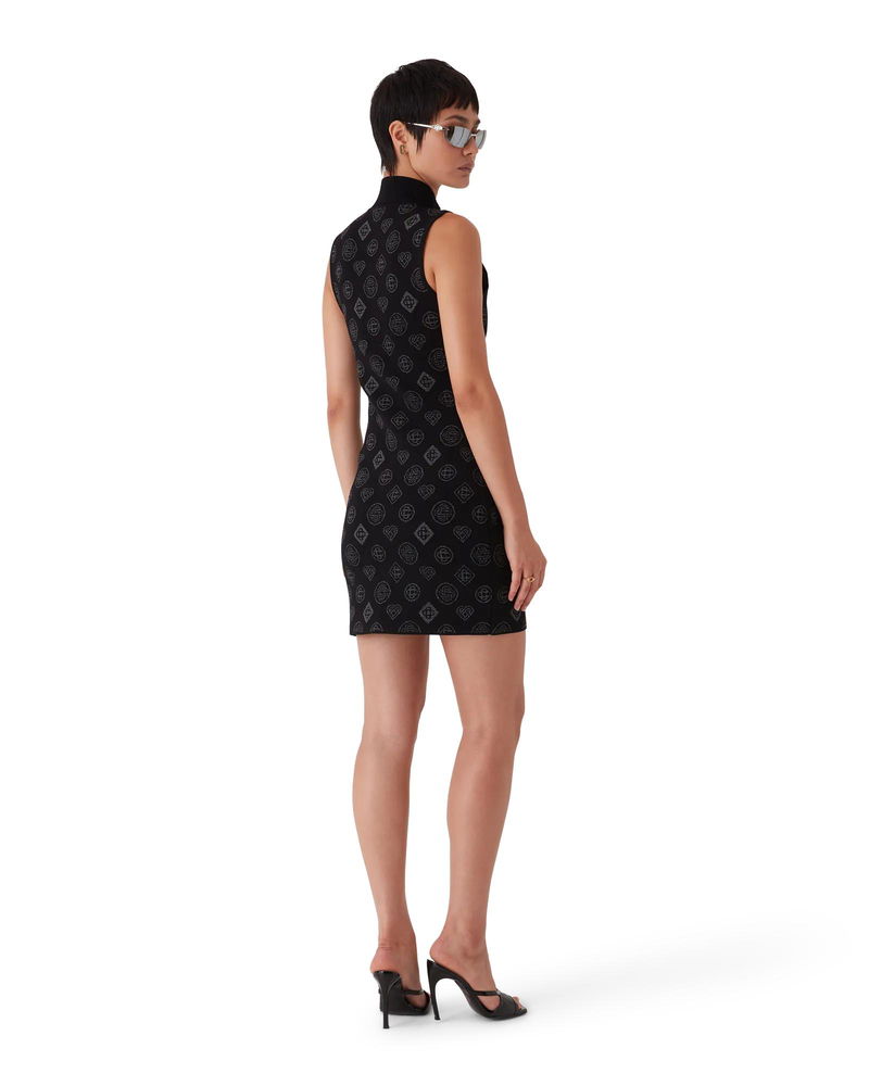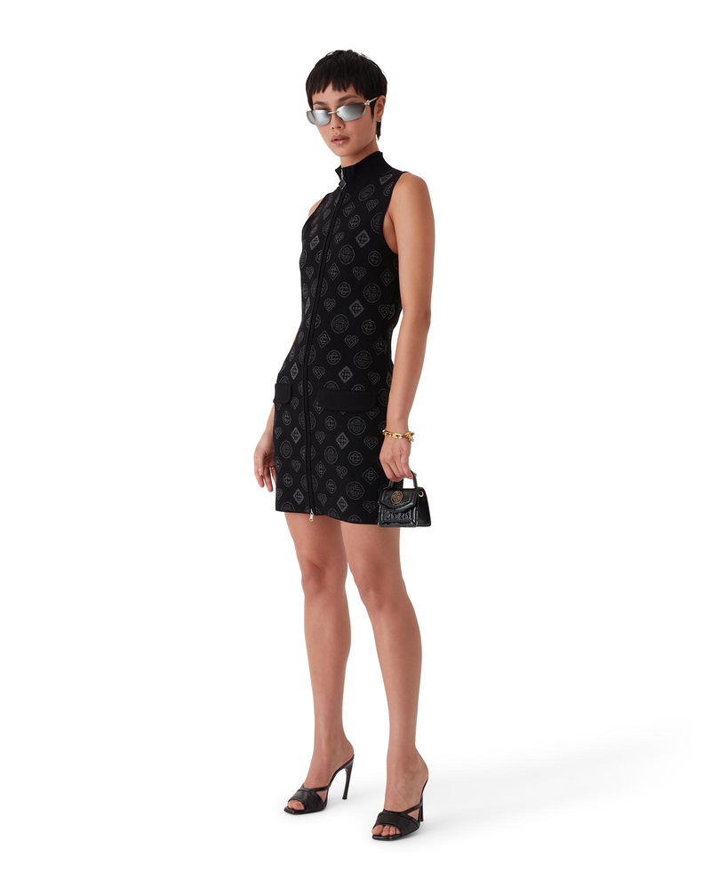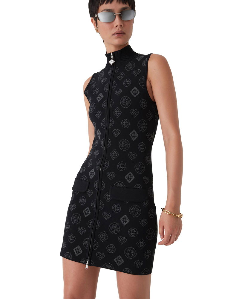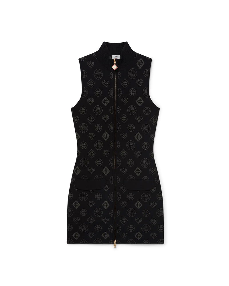 The monogram jacquard dress is a sleeveless, A-line mini design crafted from a polyester-blend fabric featuring the house's Honeydrew logo repeat in a subtle black on black print. Completed with front zip closure featuring the house's signature diamond logo zipper tab, a band collar, and flap pockets.