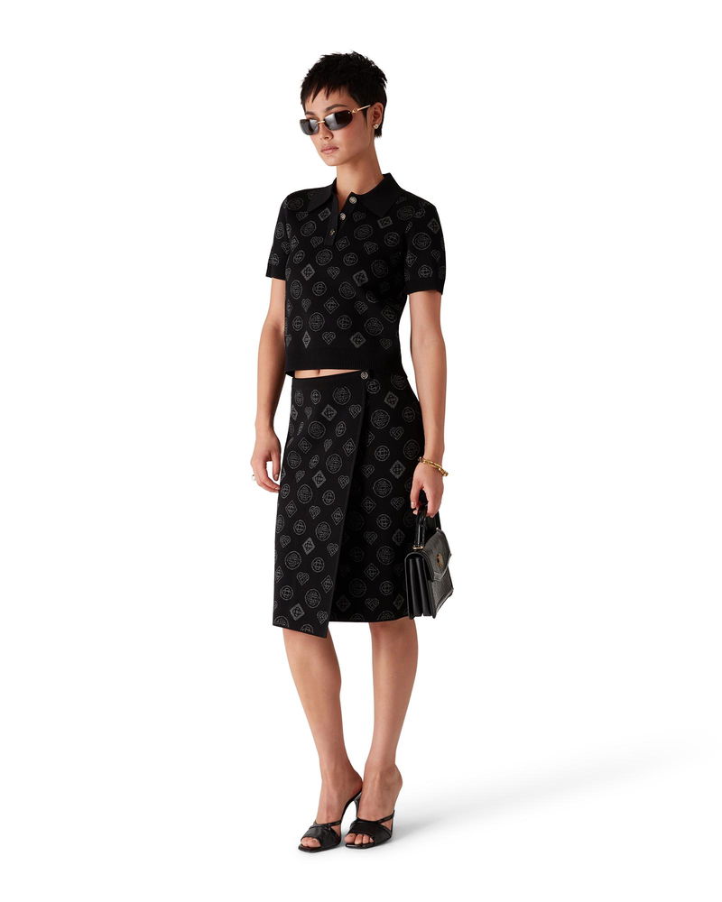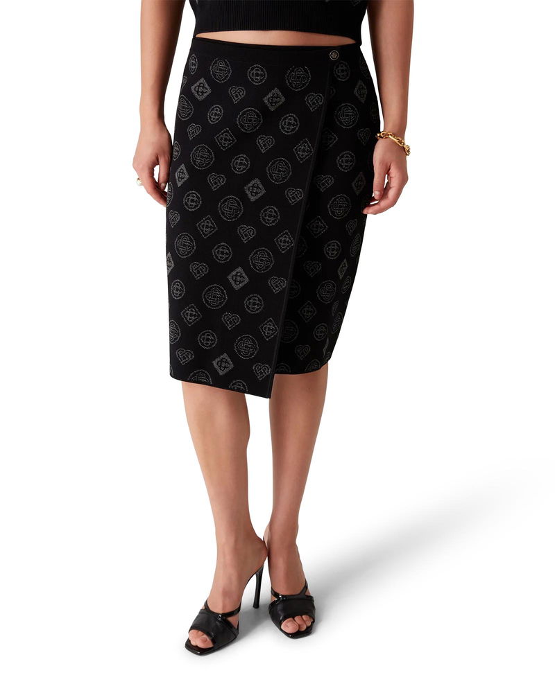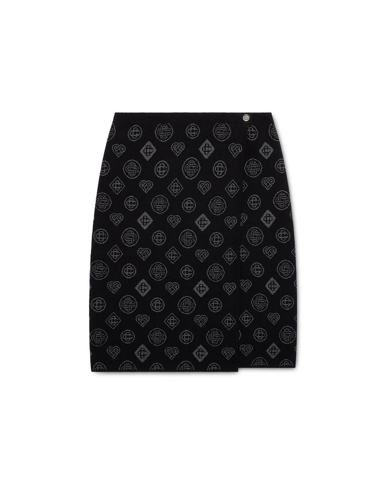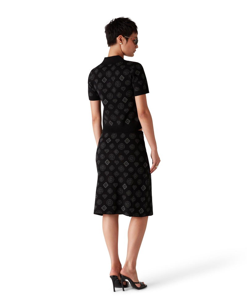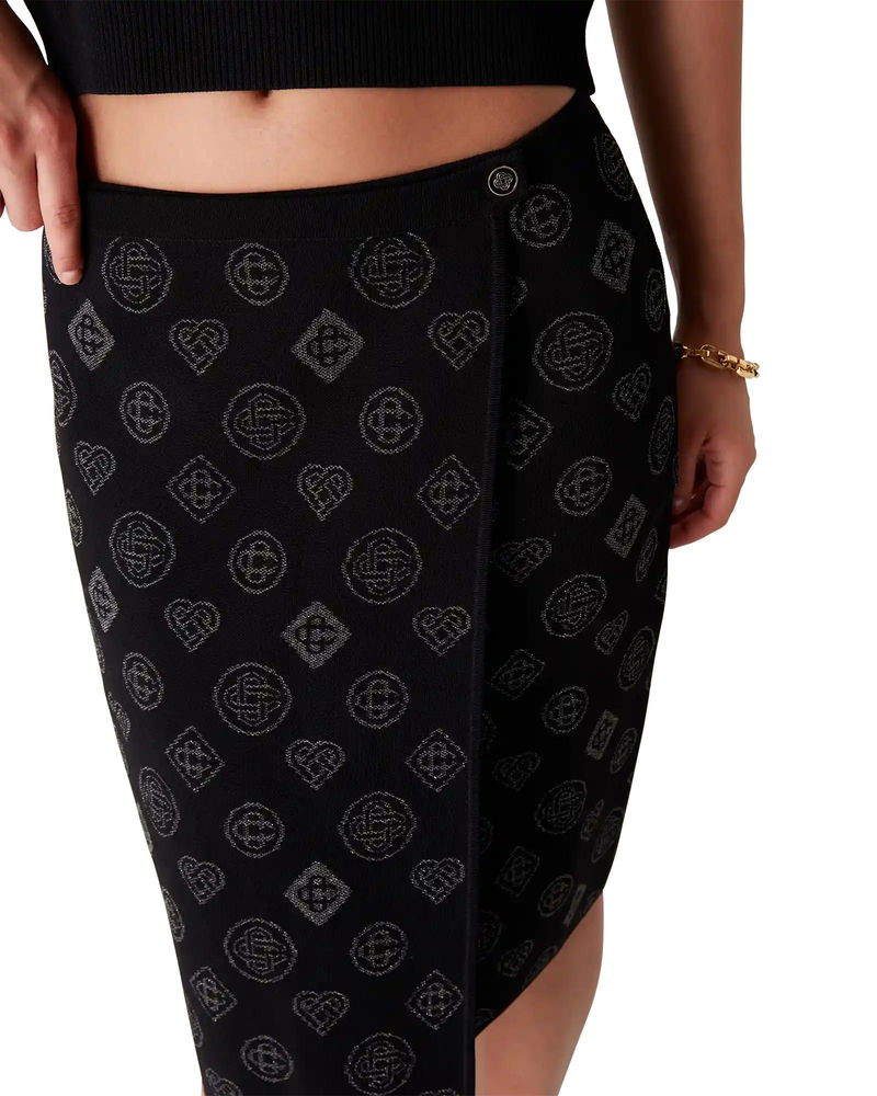 The city jacquard skirt is a classic mid-length design featuring the house's Honeydew logo repeat artwork. This repeat differs from our other monograms, as it combines unique shapes to form a cohesive pattern. It is more of an icon-based design. Completed with a contrast rib, elasticised waistband, and front slit.