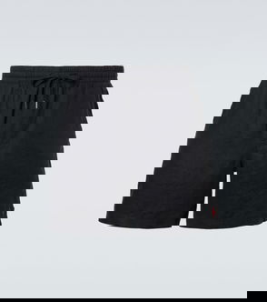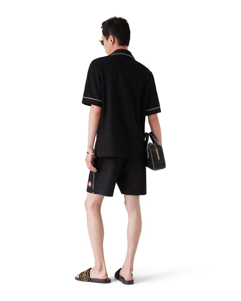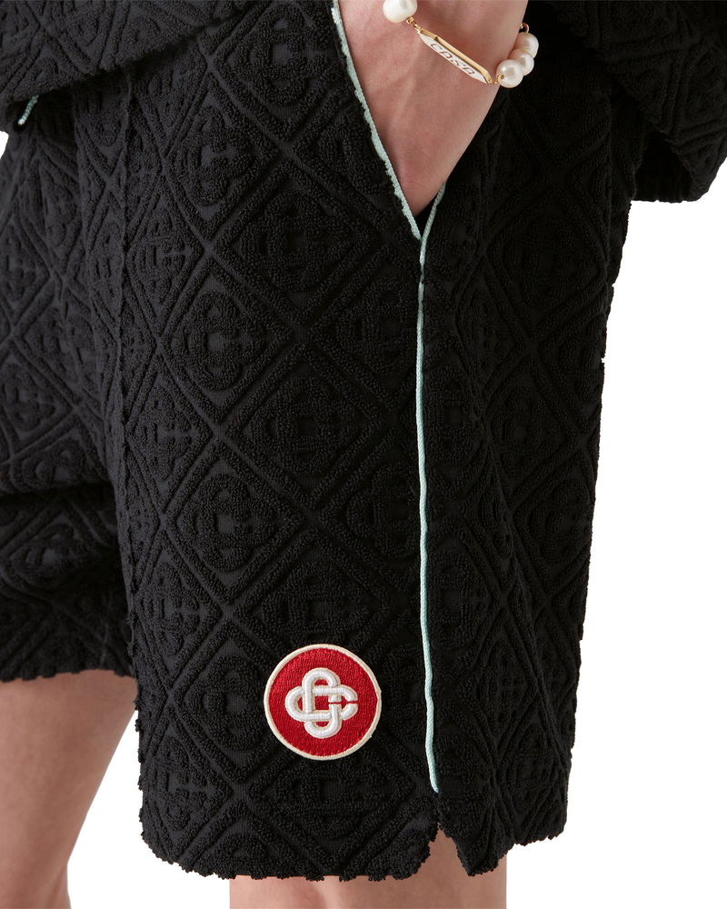 The Monogram towelling shorts are a classic design crafted from a monogram towelling fabric. Completed with an elasticated waistband, gold-tipped drawstring fastening, pin tuck seams down the front, a back pocket with zip closure, slanted side pockets, and piping details on the back and front pockets and down the sides. Monogram towelling fabric Main: 86% cotton 13% polyamide 1% elastane Lining: 100% cotton Colour: black Delicate machine wash Made in Portugal Relaxed fit The model is 187cm/6'1 and is wearing a size M Monogram Jacquard Towelling Shorts, Size XS by Casablanca Paris