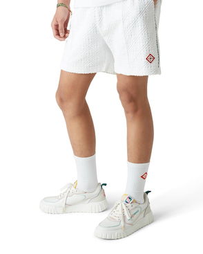 The monogram jacquard towelling shorts are a classic sportswear design crafted from monogram towelling fabric. Completed with an elasticised waistband, drawstring fastening, a CC logo patch, in-seam pockets, a back patch pocket, and piping detail down the sides.
