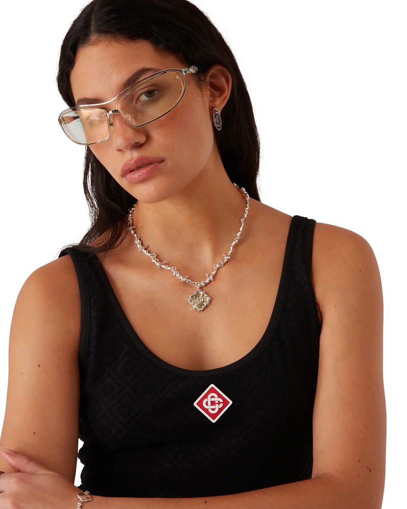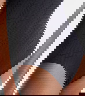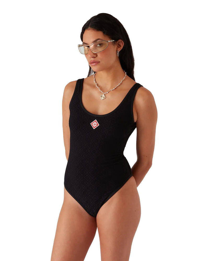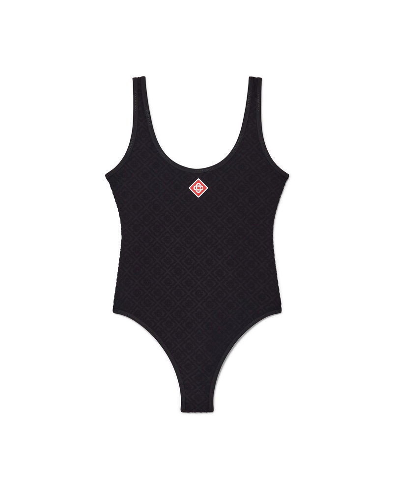 The design is completed with appliqué detailing, high-cut legs, a scoop neck, and a low-cut back, this piece features the house's signature diamond logo on the chest.