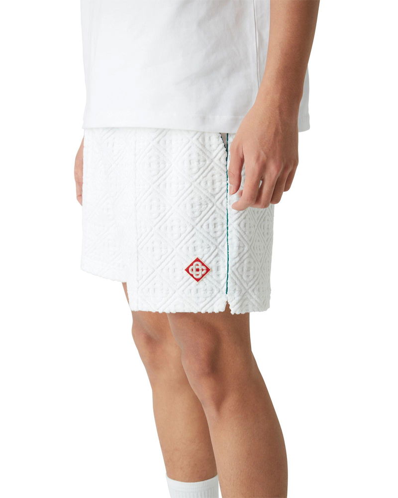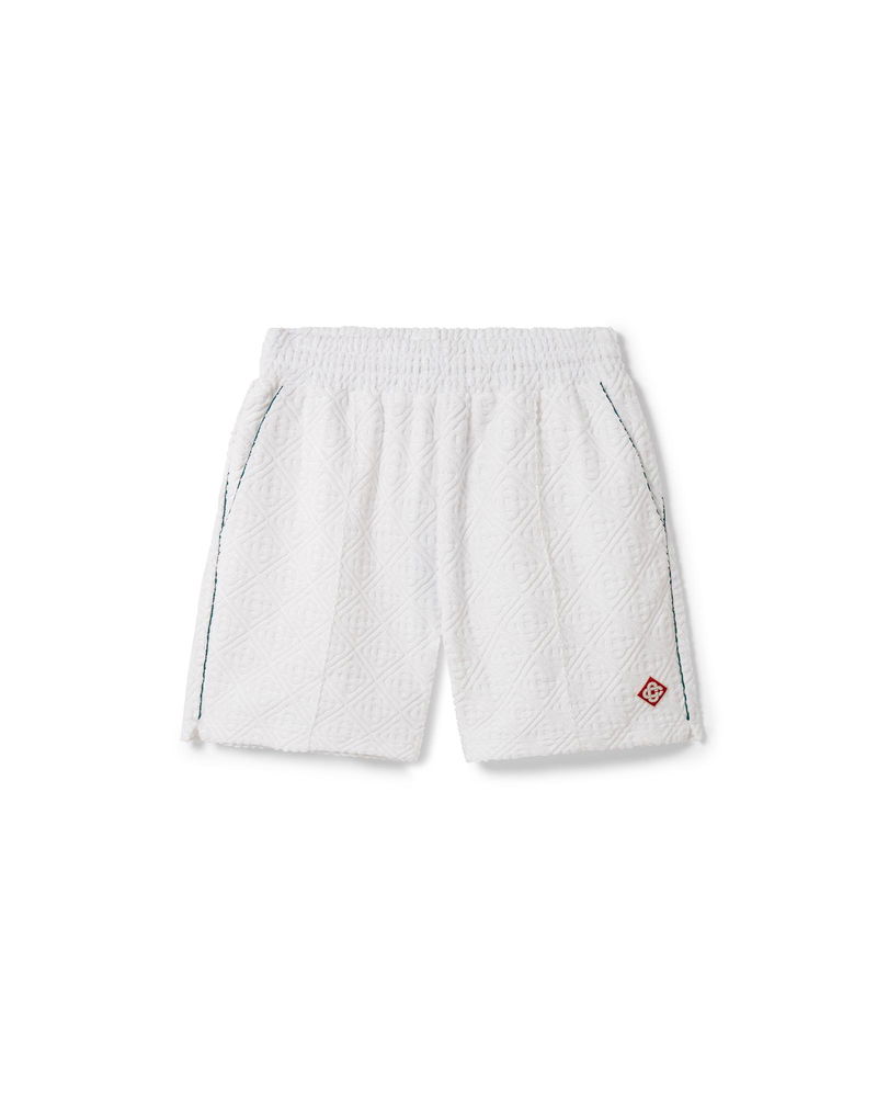 The monogram towelling shorts are crafted from a monogram cotton blend towelling fabric and feature the house's signature diamond logo. Completed with slanted front pockets, a back patch pocket, drawstring fastening, and pin-tuck seams. Towelling monogram fabric Main: 86% cotton 13% polyamid 1% elastane Lining: 100% cotton Contrast: 100% polyester Applique: 95% viscose 5% polyester Colour: white Delicate machine wash Made in Portugal Model is 186cm/6'1 and is wearing a size M Monogram Towelling Shorts, Size XS by Casablanca Paris
