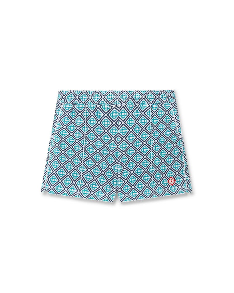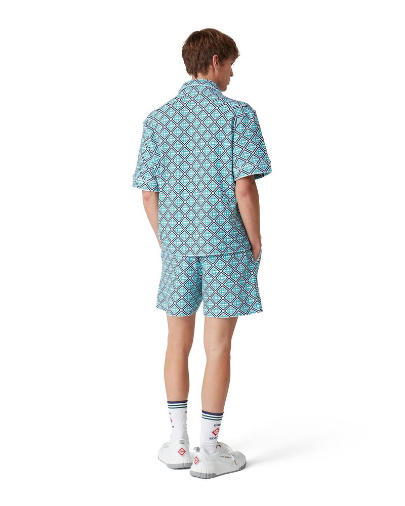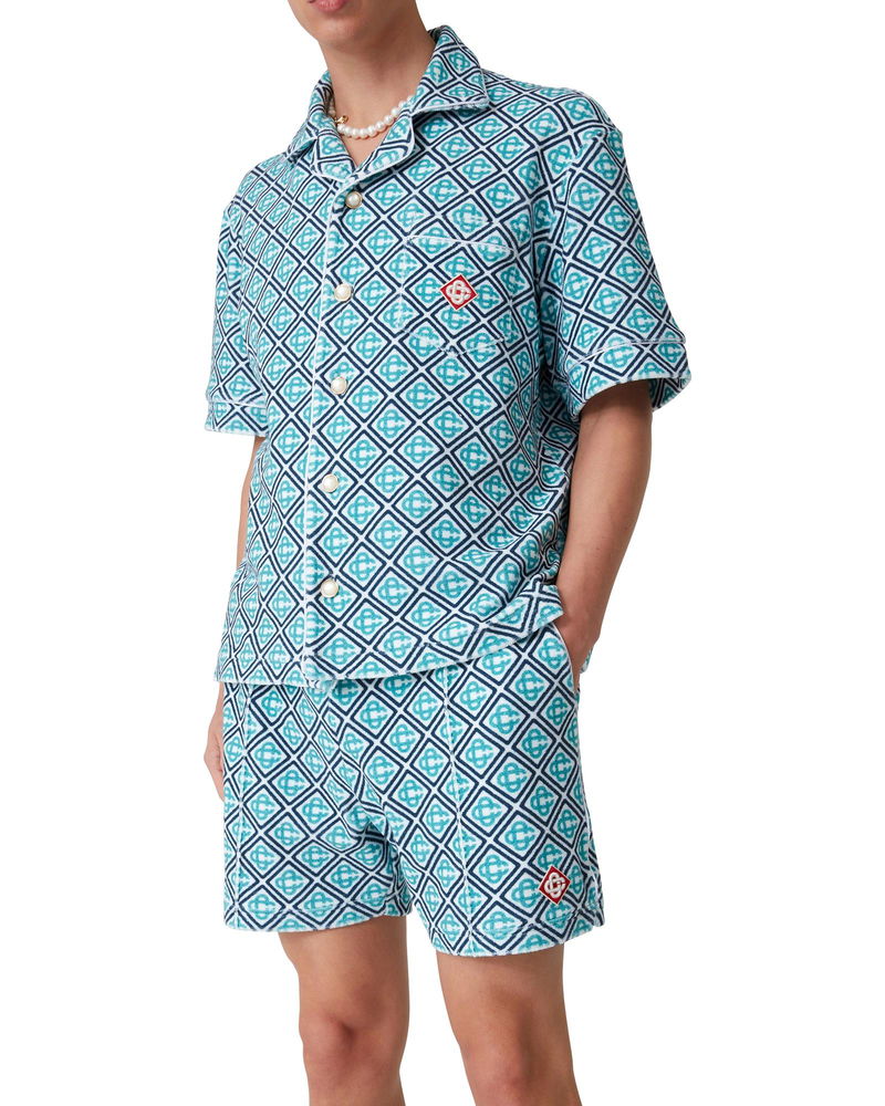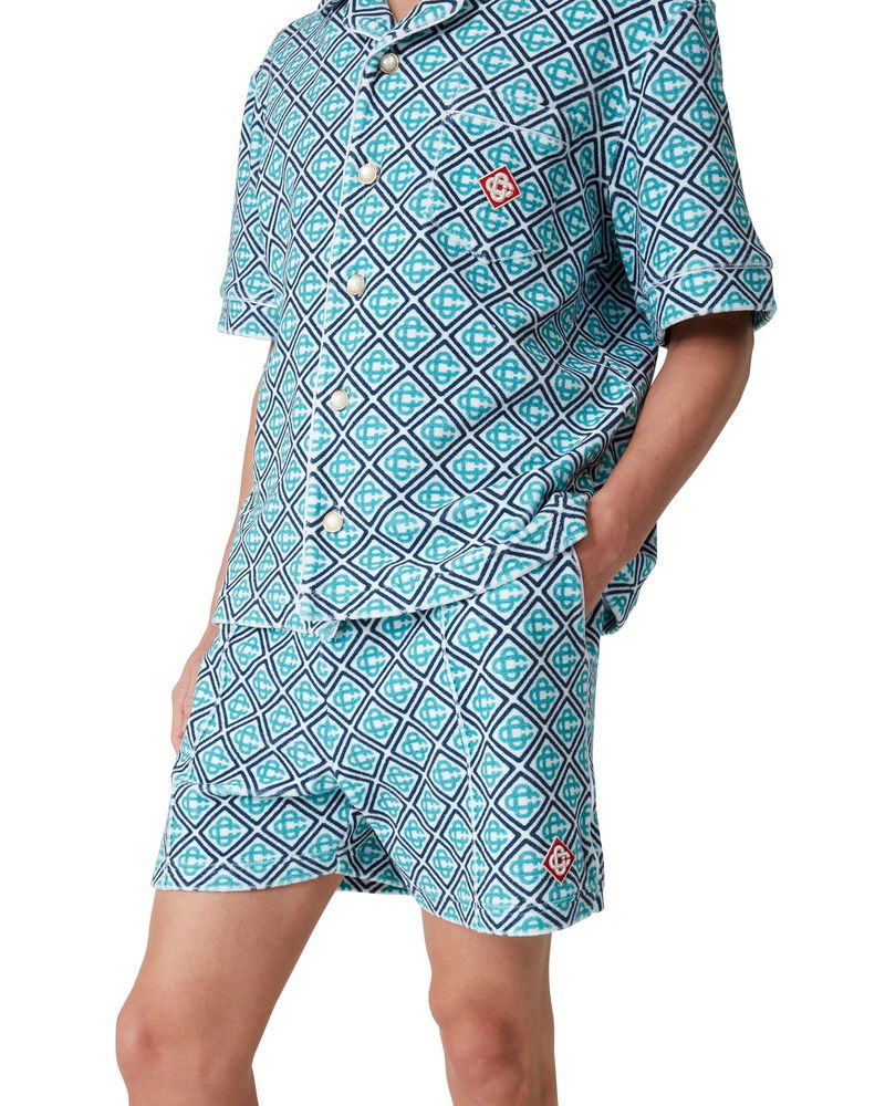 The Monogram towelling shorts are a classic design crafted from a monogram towelling fabric offering a twist on a signature Casablanca print. Completed with an elasticated waistband, internal gold-tipped drawstring fastening, pin tuck seams down the front, a back pocket with zip closure, slanted side pockets, and piping details on the back and front pockets and down the sides. Monogram towelling fabric 86% cotton 13% polyamide 1% elastane Monogram print blue Delicate machine wash Made in Portugal The model is 185cm/6'1 and is wearing a size M Exclusive to casablancaparis. com, our flagship stores and selected retailers Monogram Towelling Shorts, Size XS by Casablanca Paris