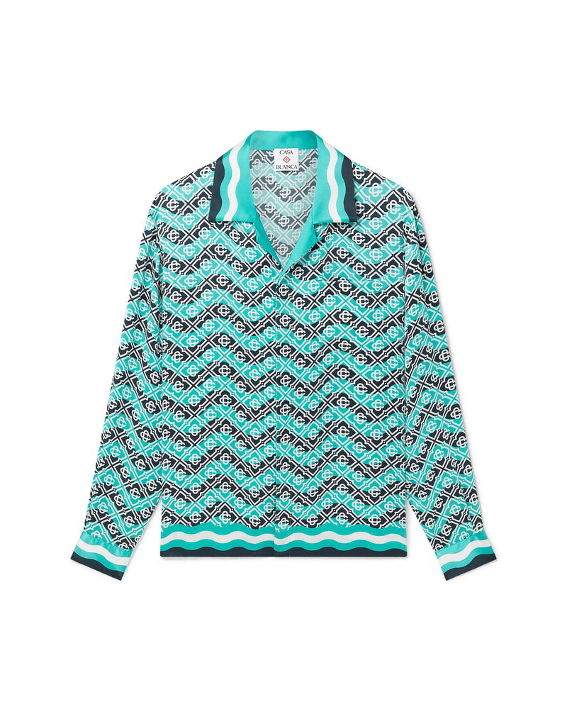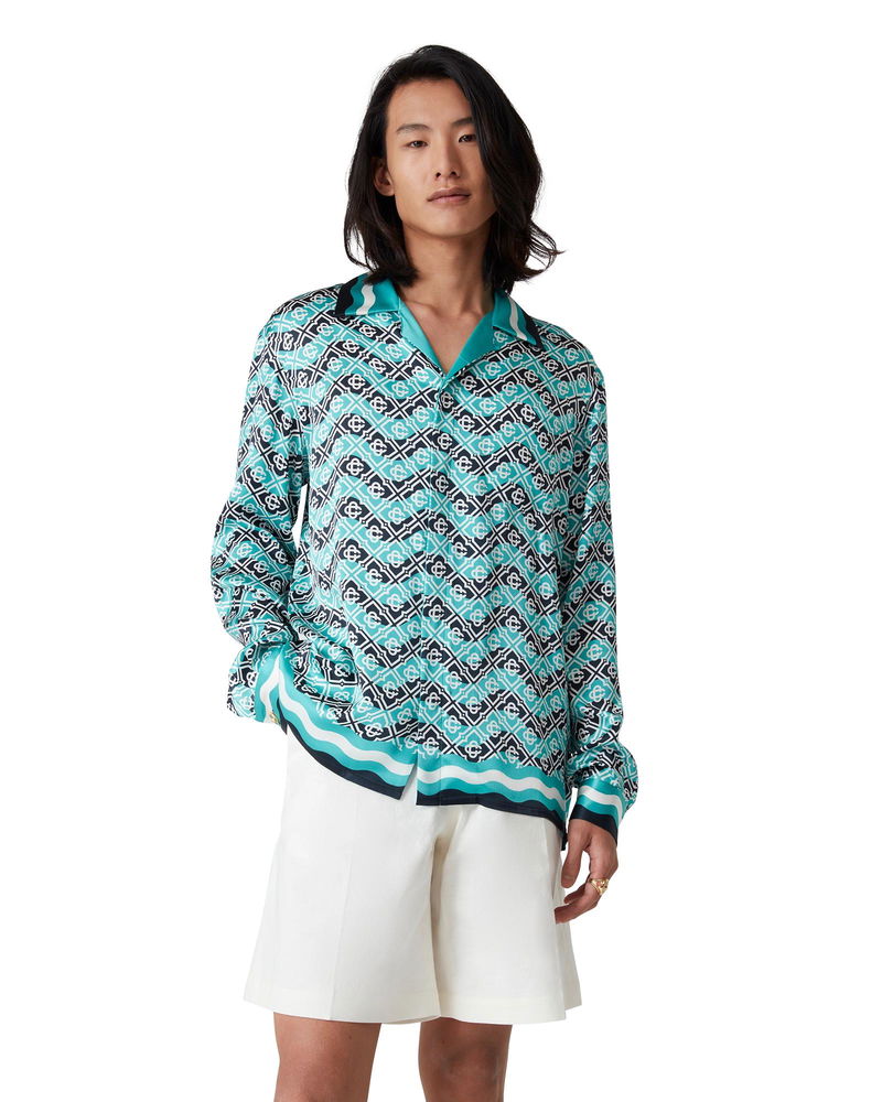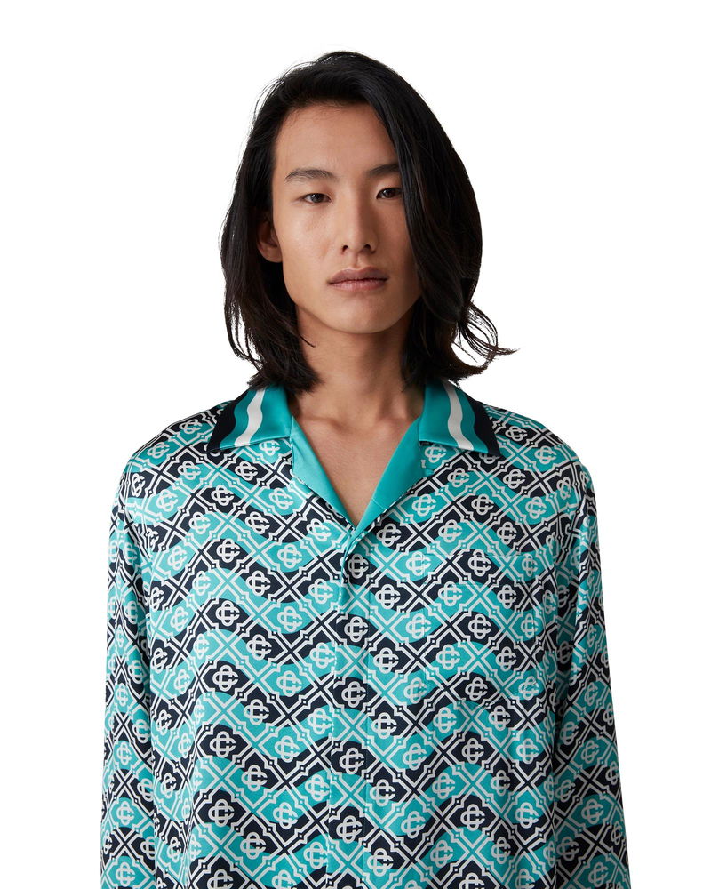 The Monogram Wave silk shirt is an all-over printed style in the house's signature monogram crafted from a silk satin fabric. Completed with front button closure with interlocking CC corozo buttons, gold rim enamel buttons on the cuffs, a Cuban collar, and Memphis-wave-inspired stripe detail in the collar, cuffs, and hem. Monogram wave silk satin fabric 100% silk Monogram print blue Delicate machine wash Made in Italy The model is 187cm/6'1 and is wearing a size M Exclusive to casablancaparis. com, our flagship stores and selected retailers Monogram Wave Long Sleeve Silk Shirt, Size XS by Casablanca Paris