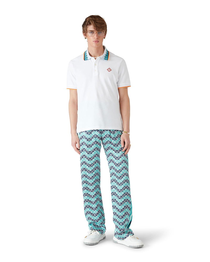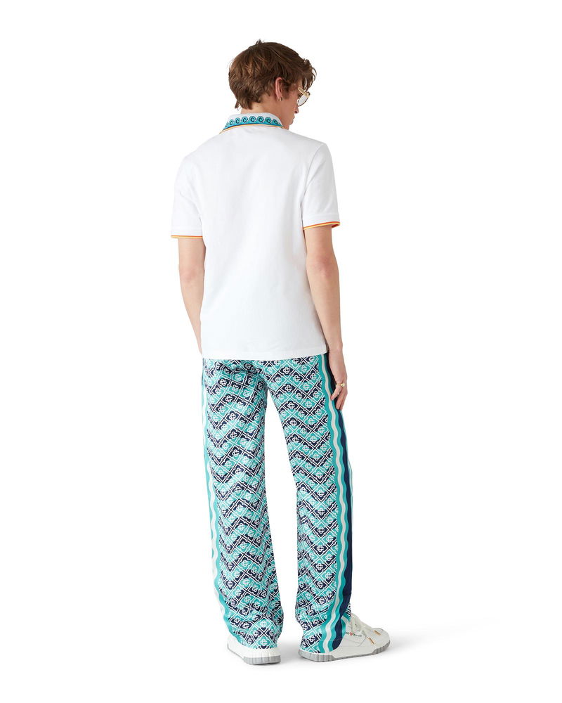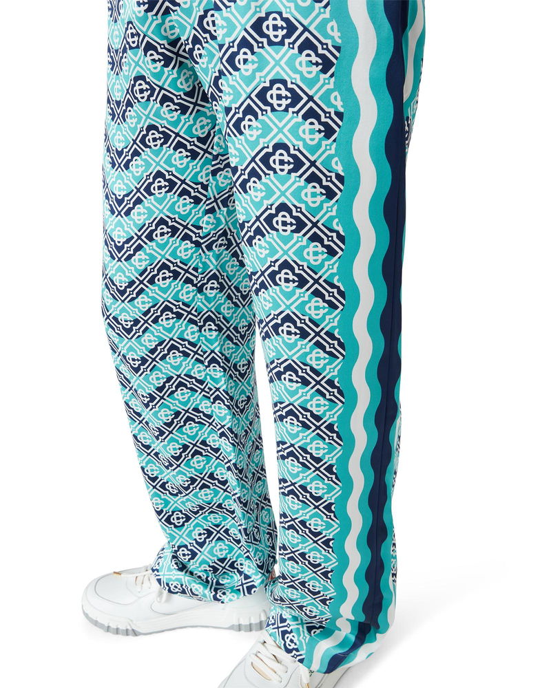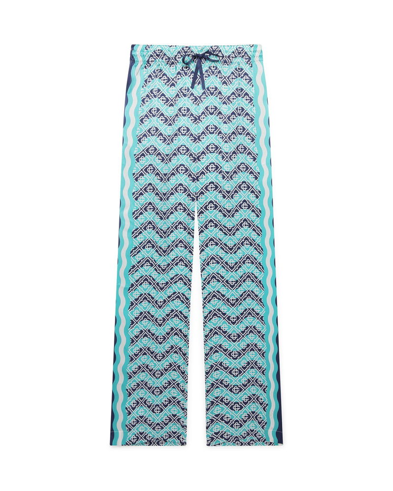 The Monogram Wave silk trousers are an all-over printed style in the house's signature monogram crafted from a silk satin fabric. Completed with an elasticated waistband, drawstring fastening, Memphis-wave-inspired stripe detail down the sides, and in-seam side pockets. Silk satin fabric 100% silk Monogram wave print blue Specialised dry clean only Made in Italy The model is 185cm/6'1 and is wearing a size M Exclusive to casablancaparis. com, our flagship stores and selected retailers Monogram Wave Silk Trousers, Size Medium by Casablanca Paris