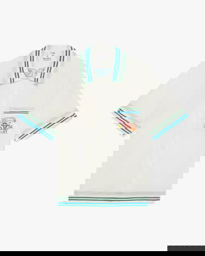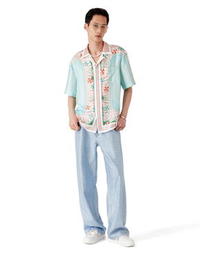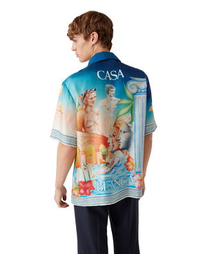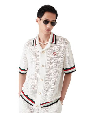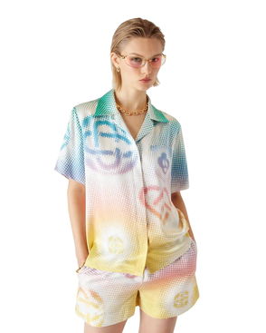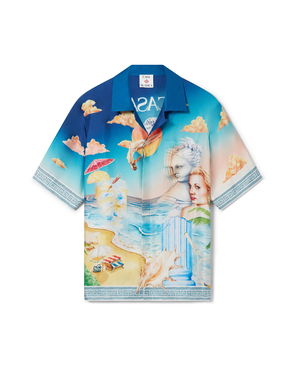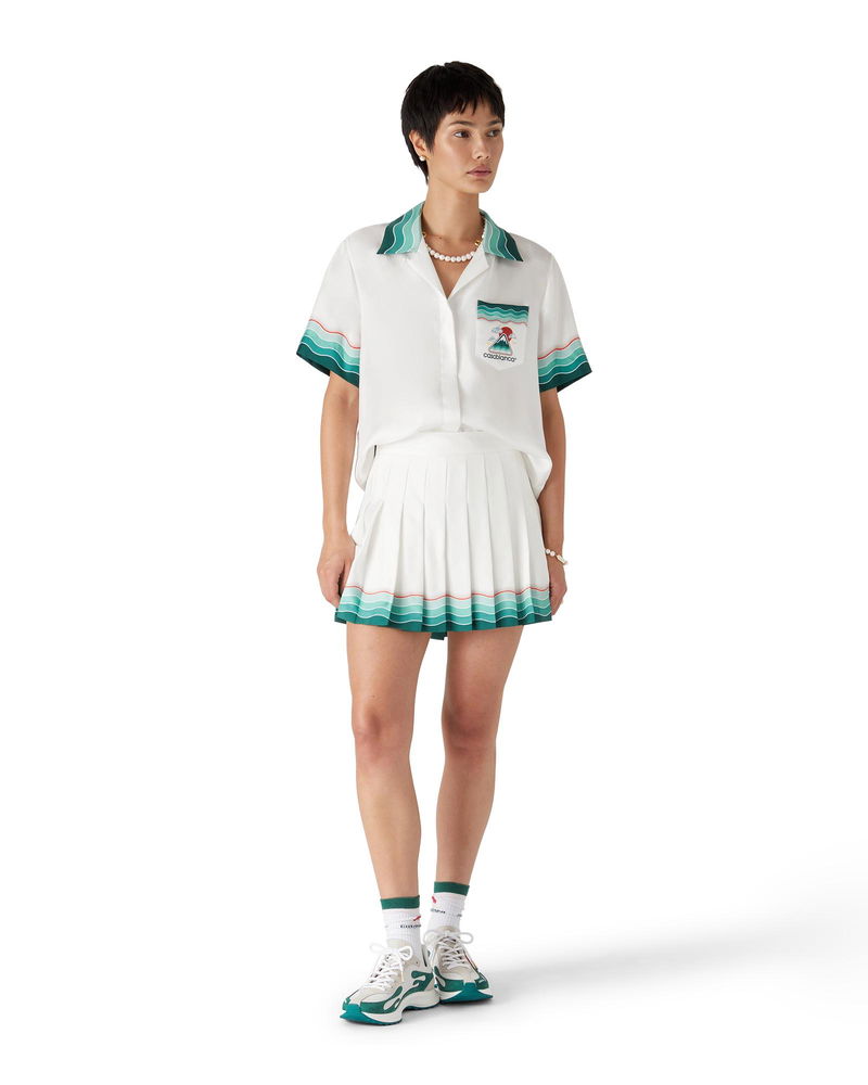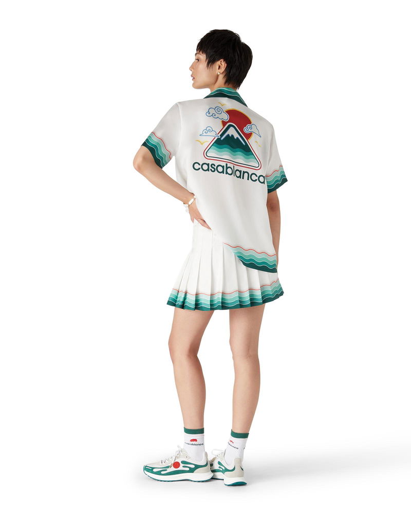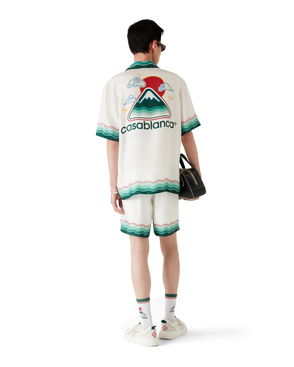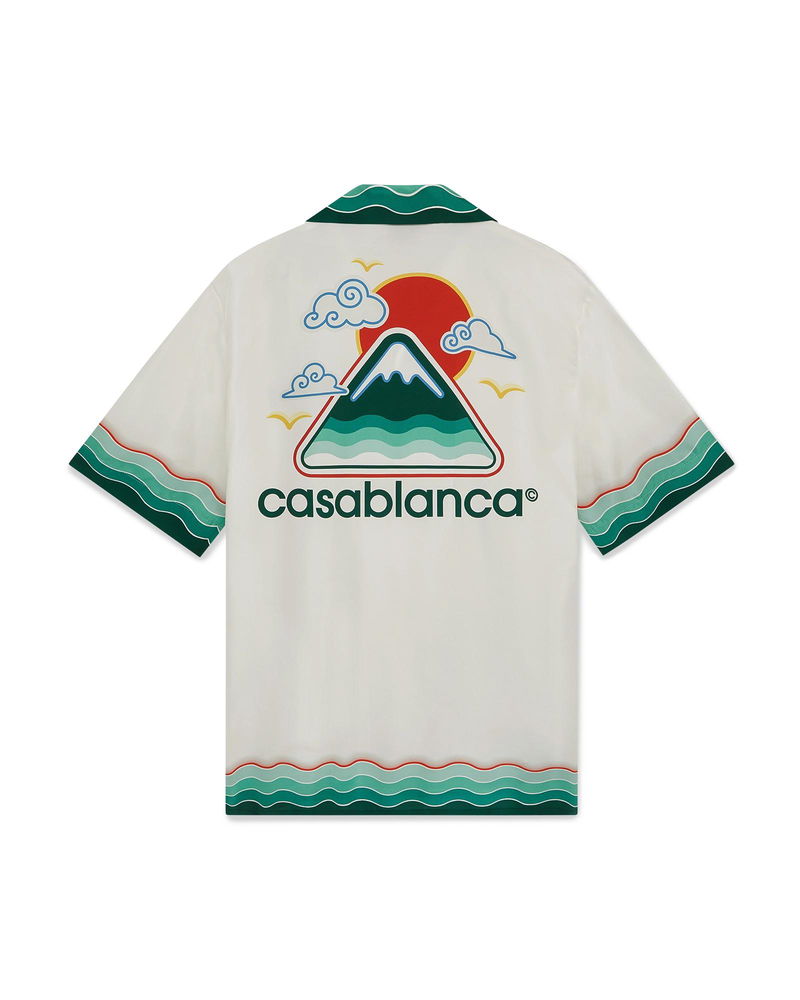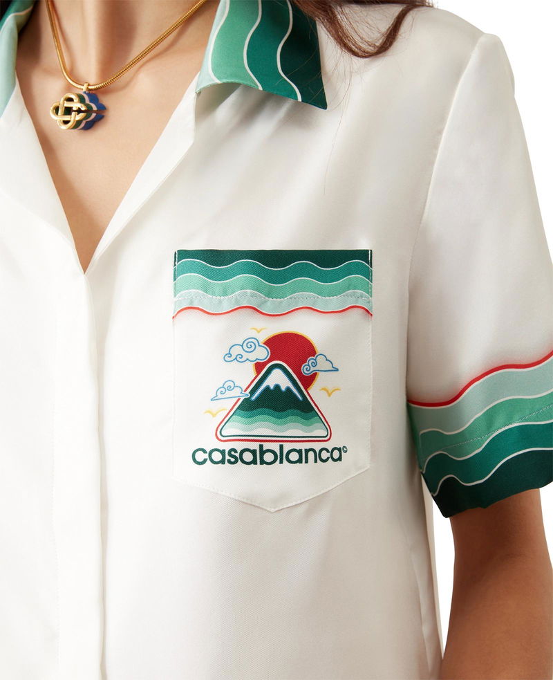 The Montagne Ondulee silk short-sleeve shirt is an all-over printed design featuring the house's seasonal artwork - using Japan's rich iconography as inspiration for this collection, with a simple layout and artwork, conveying a strong visual message with just a few lines and colours, making it one of the emblems of the collection - crafted from silk twill fabric. Completed with a Cuban collar, hidden button closure, interlocking CC logo corozo buttons, and Memphis wave-inspired stripe edge detail on the collar, cuffs, and hem.