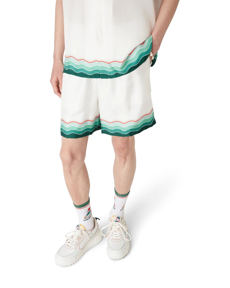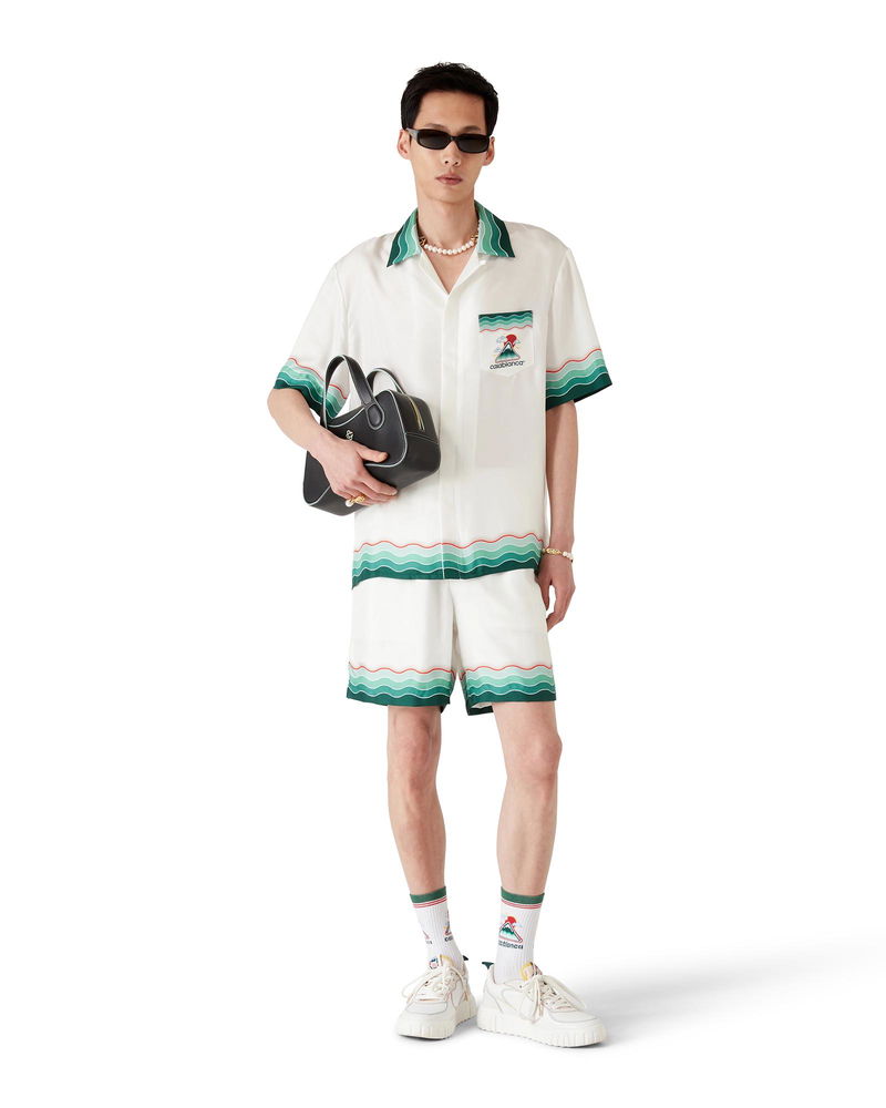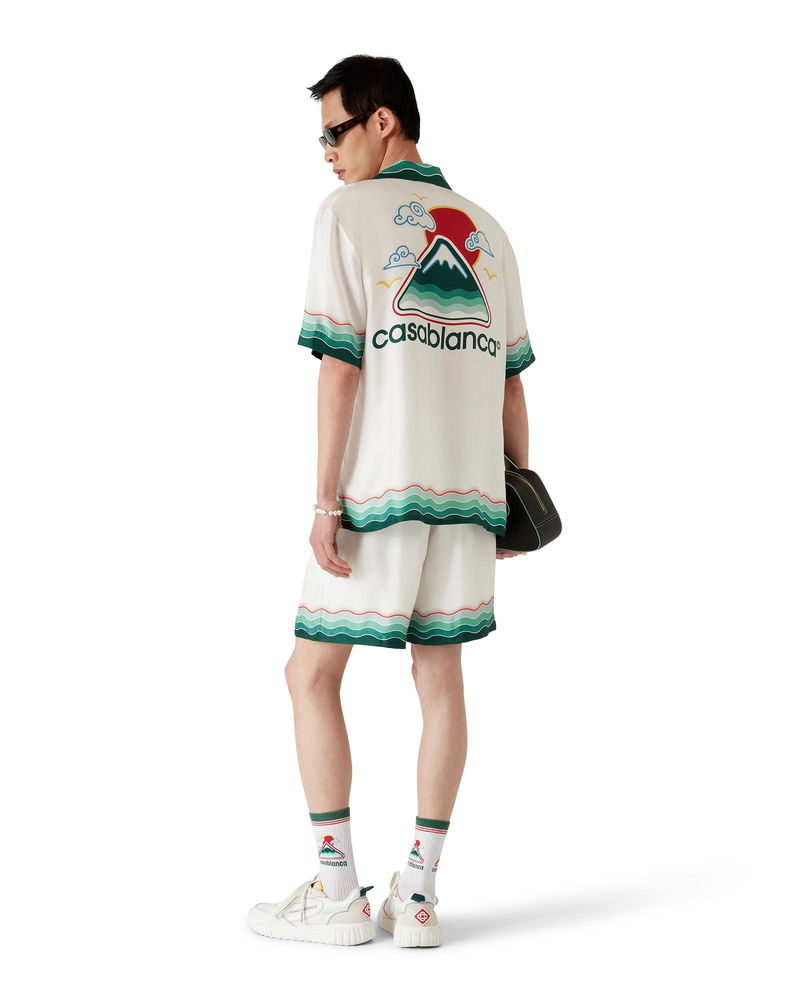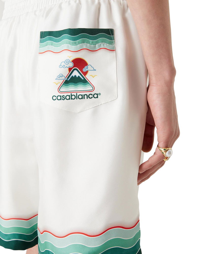 The Montagne Ondulee silk shirt is a short-sleeve all-over printed design featuring the house's seasonal artwork - using Japan's rich iconography as inspiration for this collection, with a simple layout and artwork, conveying a strong visual message with just a few lines and colours, making it one of the emblems of the collection - crafted from silk twill fabric. Completed with an elasticised waistband, drawstring fastening, in-seam side pockets, a back pocket and Memphis wave-inspired stripe edge detail on the hem and back pocket. Printed silk twill fabric 100% silk Montagne Ondulee print multicolour Specialised dry clean only Made in Italy Relaxed fit The model is 187cm/6'1 and is wearing a size M Montagne Ondulee Silk Shorts, Size XS by Casablanca Paris