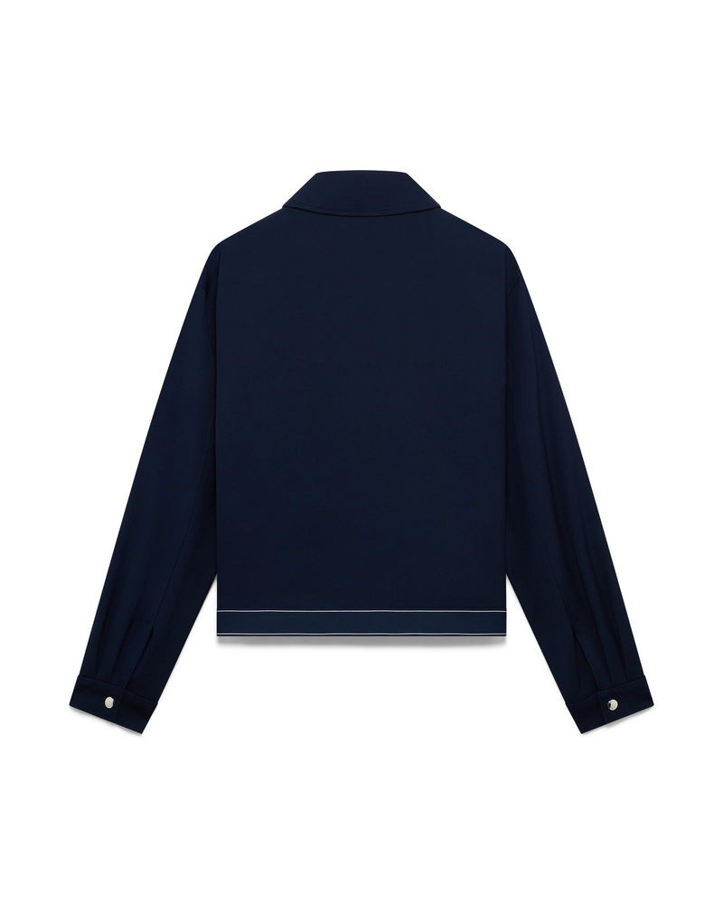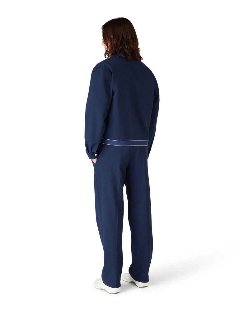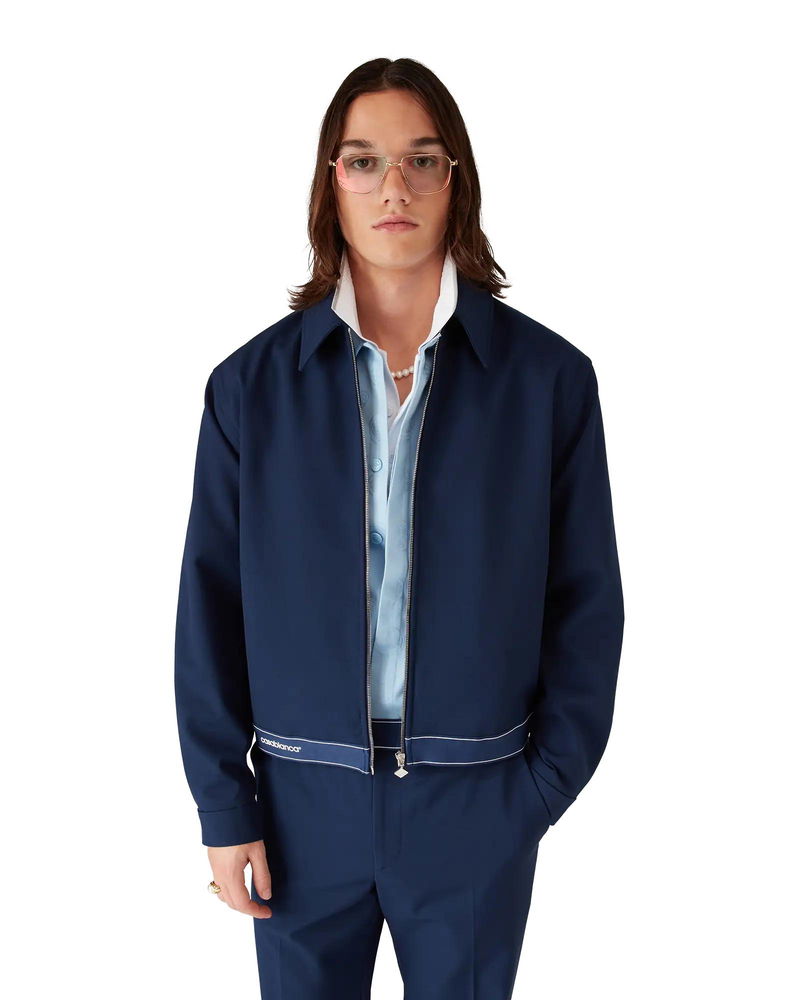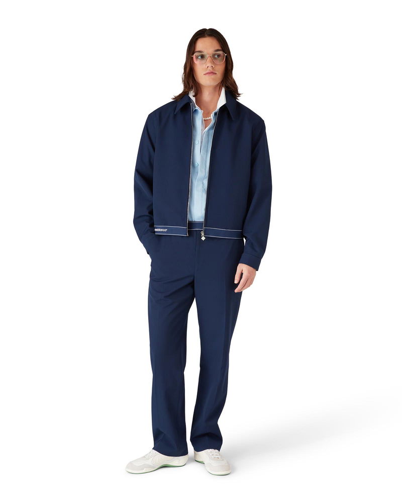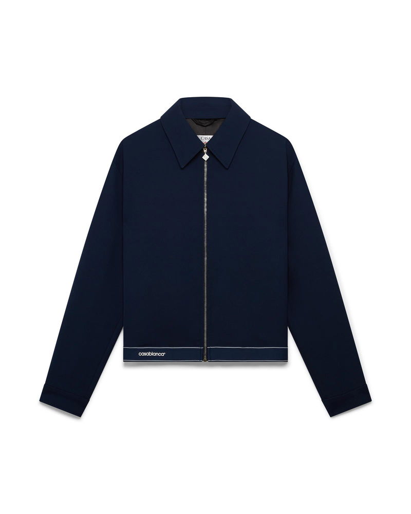 The navy wool sports jacket is a refined design crafted from a wool blend fabric, reflecting the house's sport-leisure sensibility. Completed with a point collar, a front zip closure with a signature diamond logo zipper tab, a lining, branded gold-plated hardware, and tape hem detail featuring the house Casablanca logo with stripe edge detail. Wool blend fabric 55% polyester 43% wool 2% elastane Colour: navy Casablanca logo branding Specialised dry clean only Made in Portugal The model is 186cm/6'1 and is wearing a size M Relaxed fit Navy Wool Sports Jacket, Size Medium by Casablanca Paris
