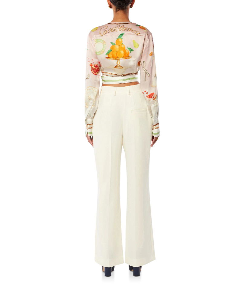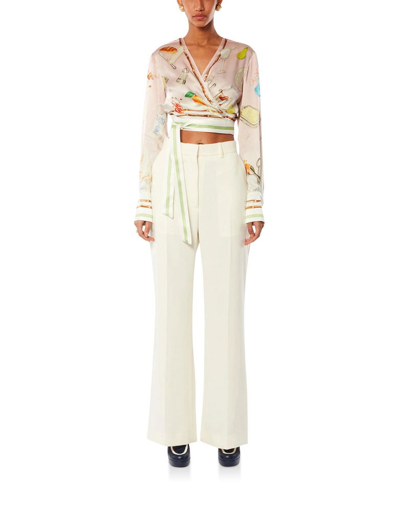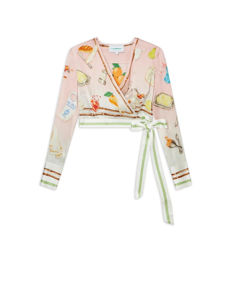 The Ne Pas Deranger wrap blouse is a long-sleeve v-neck design featuring an all-over print featuring the house's classic iconographic orange pyramid. Crafted from a silk twill fabric, this piece is completed with a wrap-over ribbon closure, stripe detail on the collar, cuffs, hem and ribbon, and a Casablanca branded label.