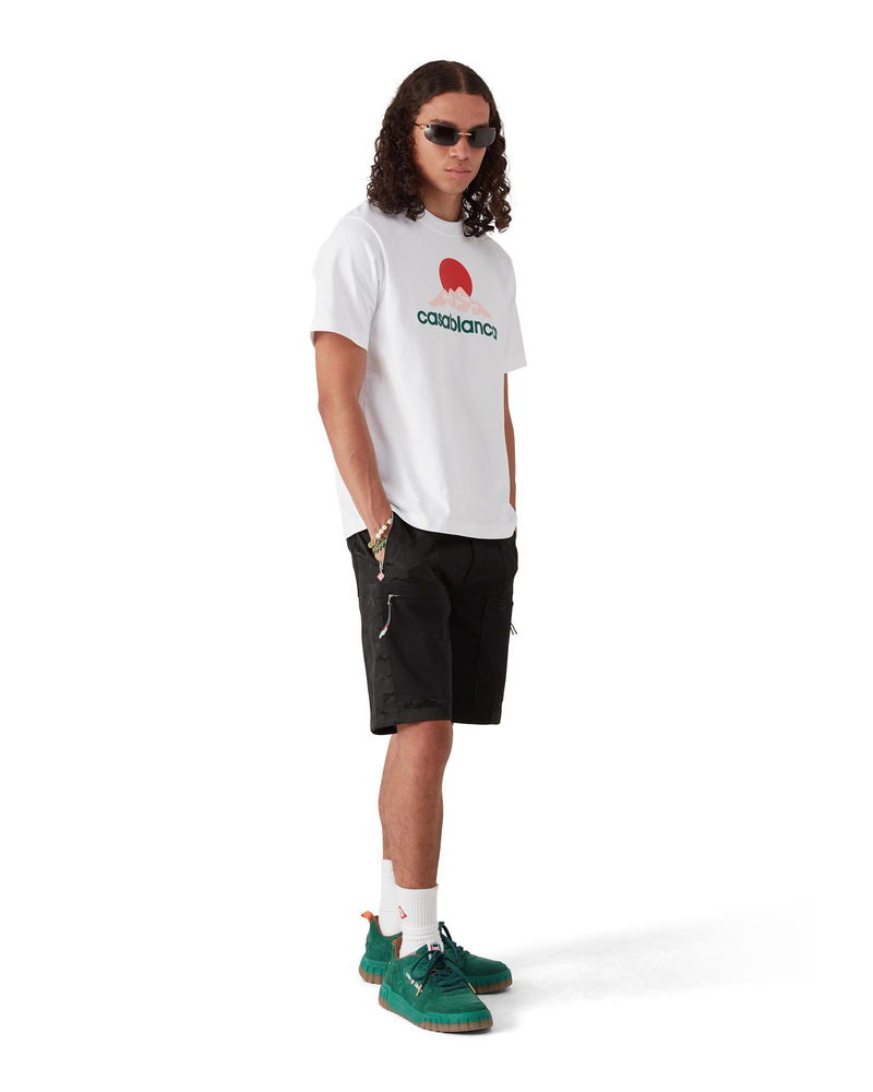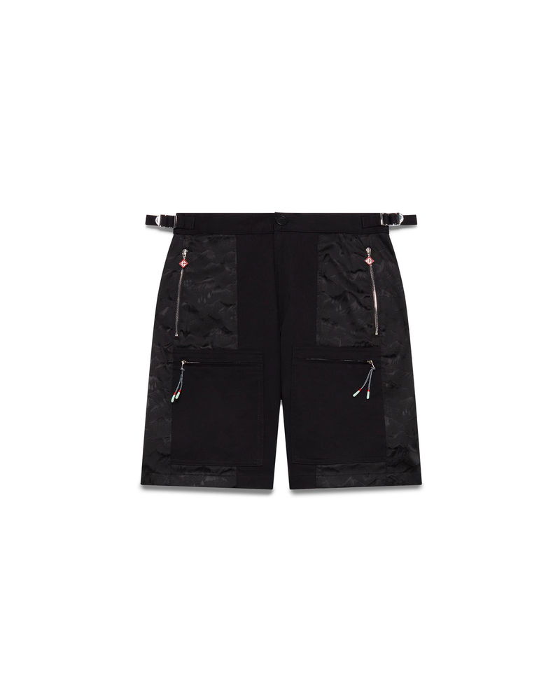 The nylon mountain camo cargo shorts are a knee-length design crafted from jacquard nylon and cotton fabric. Completed with slanted patch pockets featuring vertical zips with the house's signature diamond logo zipper tabs, a lining, patch pockets on the thighs with zip closures featuring mountaineering rope-inspired string tabs, back patch pockets, a zip closure, and side adjusters. Jacquard fabric Main: 97% organic cotton 3% elastane Lining: 100% cotton Mountain Camo print Specialised dry clean only Made in Italy Relaxed fit The model is 187cm/6'1 and is wearing a size M Nylon Mountain Camo Cargo Shorts, Size 46 by Casablanca Paris