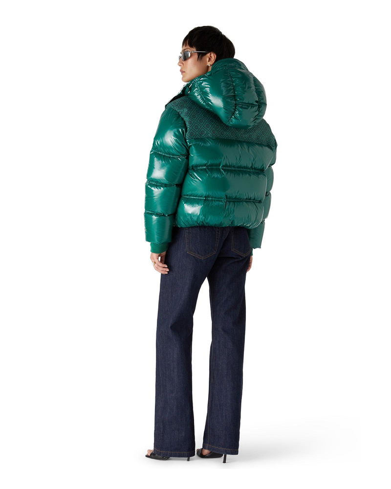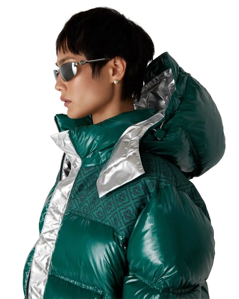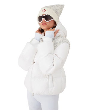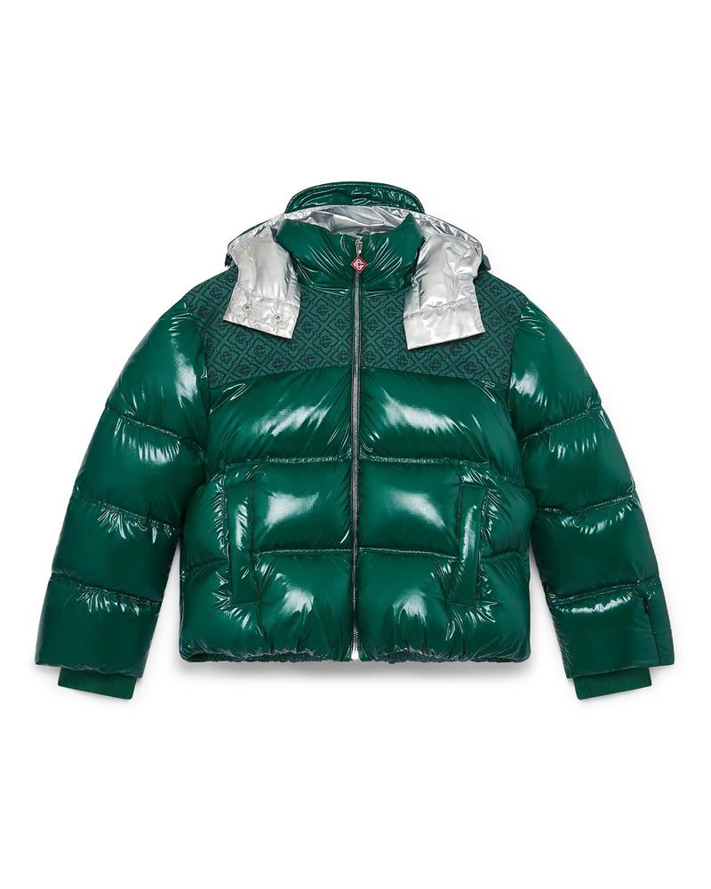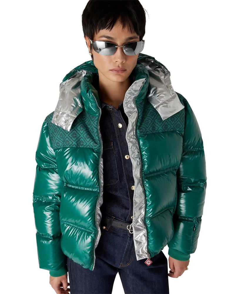 The nylon puffer down jacket is a modern boxy outerwear design crafted from ripstop nylon fabric with down filling and contrasting monogram jacquard panel across the shoulders. Completed with a hood featuring CC logo toggles and drawstring fastenings, a stand-up collar providing extra warmth and protection against the elements, a zip closure with the house's signature diamond logo zipper tab, front pockets with zip closure, branded adjustable cuff straps, and elasticised hem and cuffs.