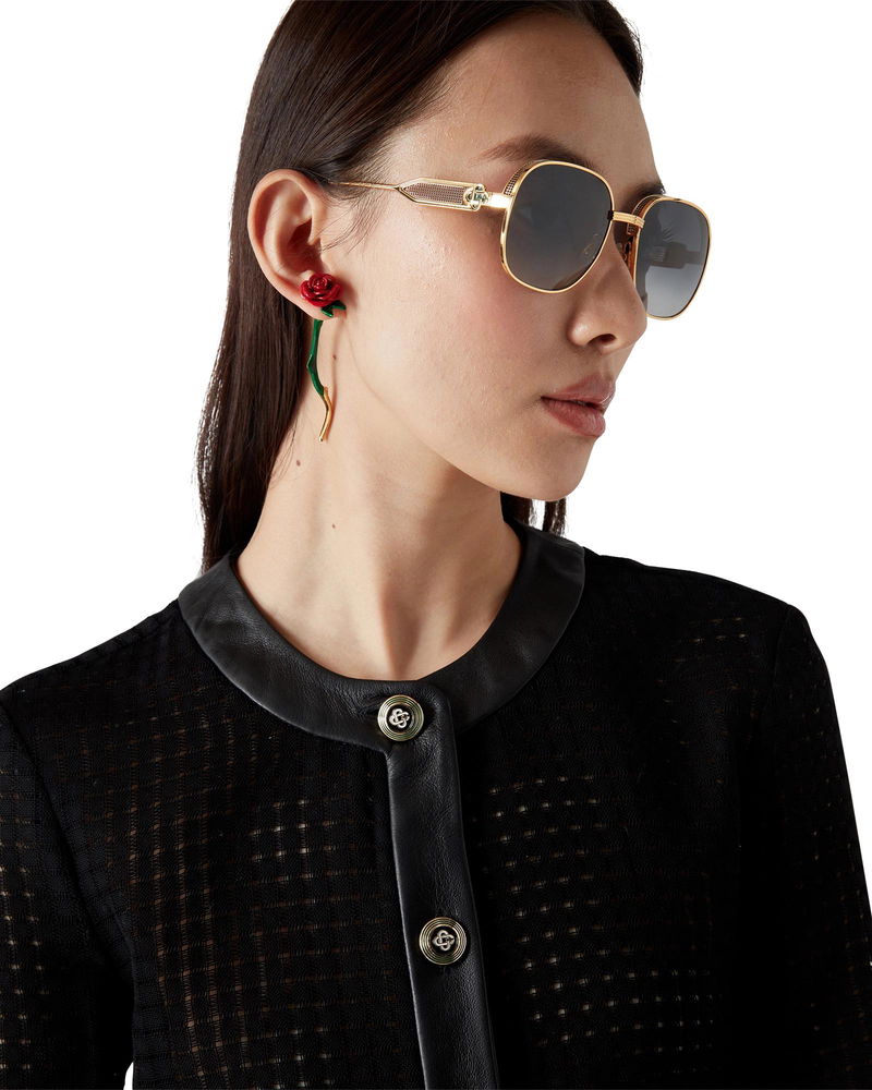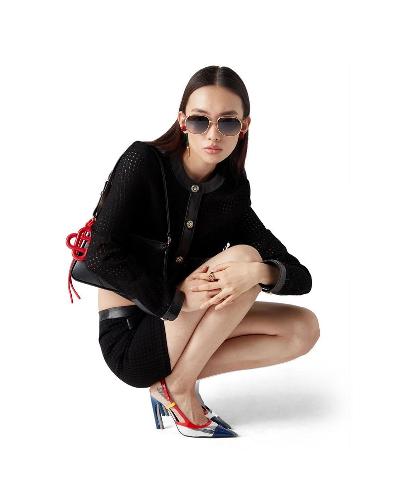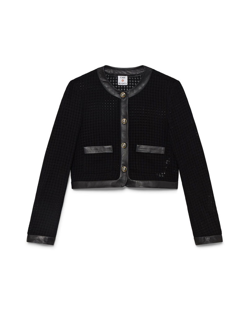 The open weave cropped tailored jacket is a long-sleeve collarless short style crafted from cordonetto fabric. Completed with button closure, signature gold rim pearl buttons, front patch pockets and leather trims.