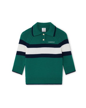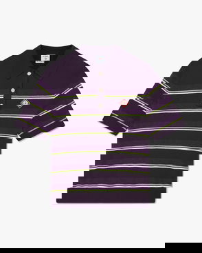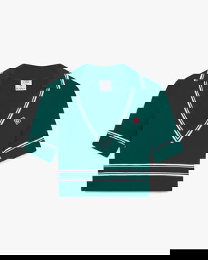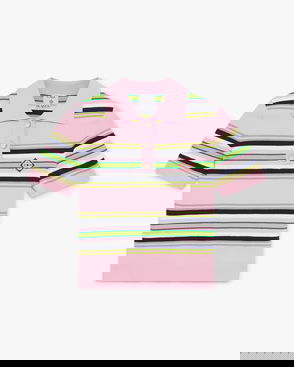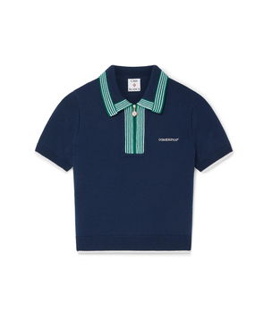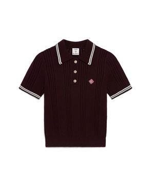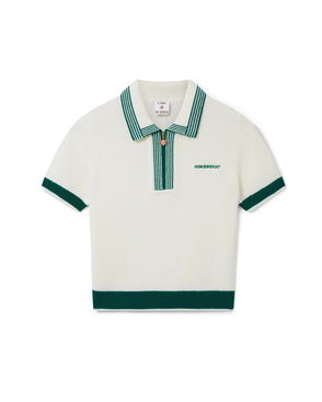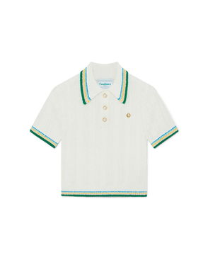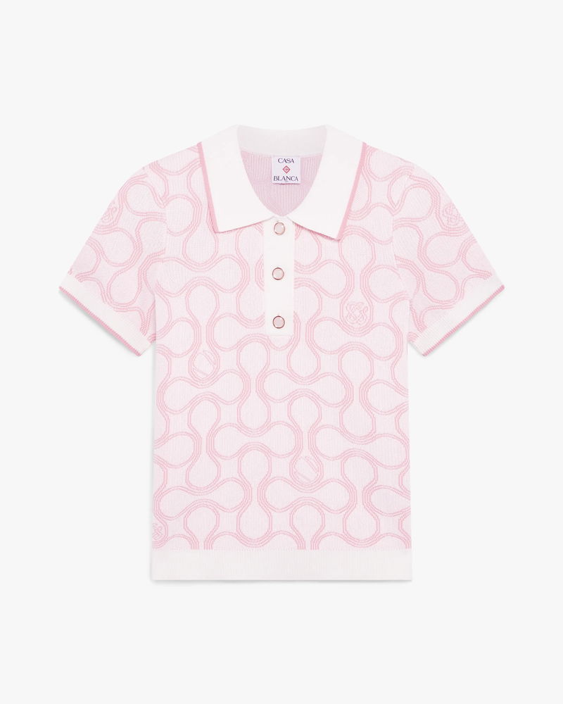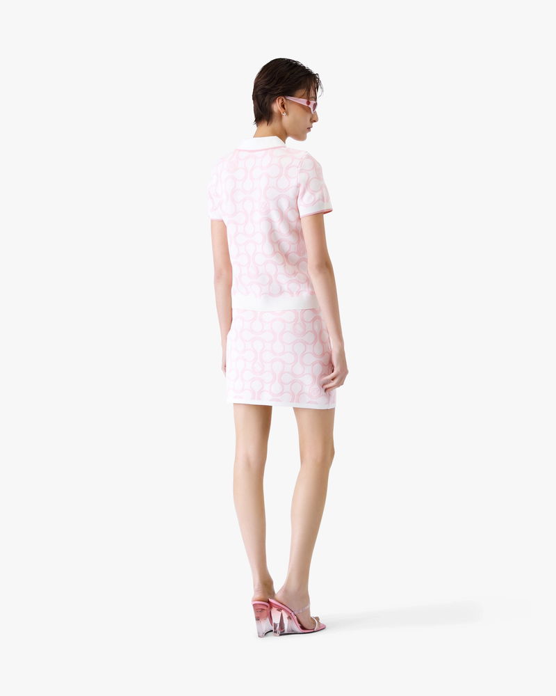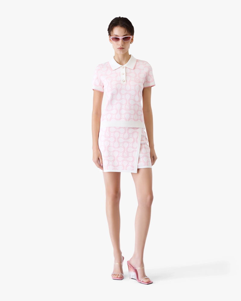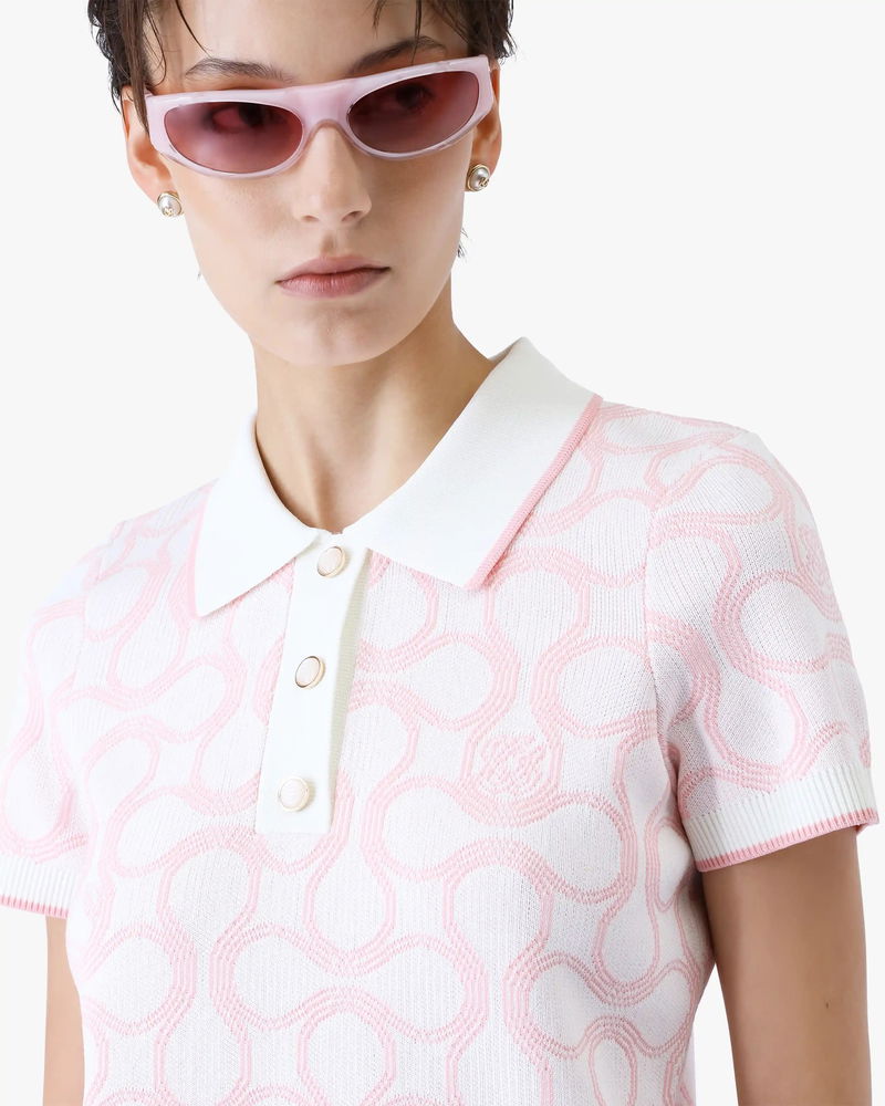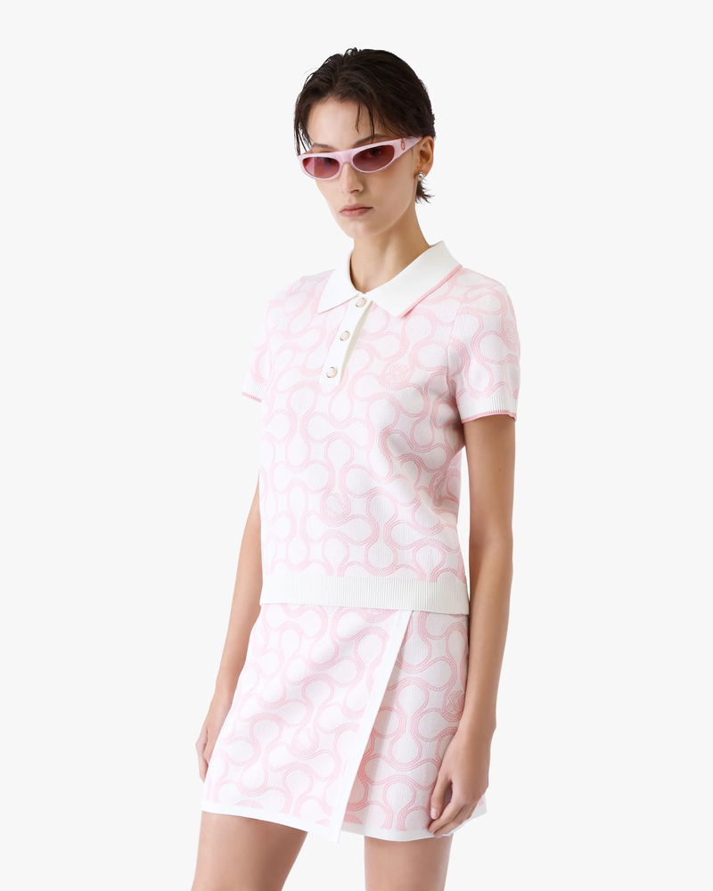 The Optic Drop polo shirt is a refined knitted design, featuring the season's artwork in the house's Bourgeois colourway. Completed with a classic rib collar, placket, cuffs and hem with contrast edge detail, button closure, signature gold-rim pearl buttons, and short-sleeves in a slim silhouette. Designed to be worn with the coordinating wrap mini skirt.