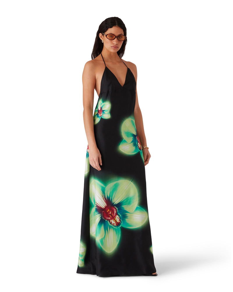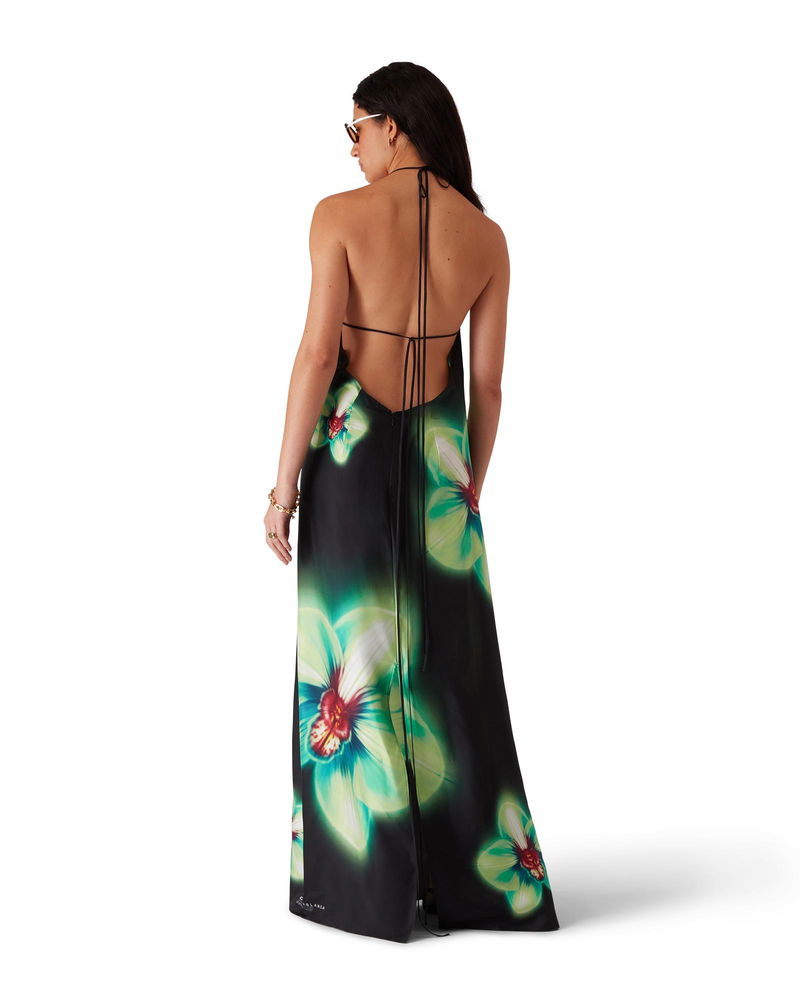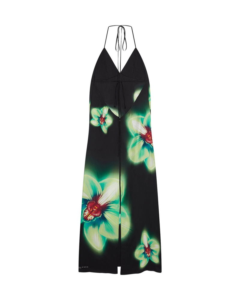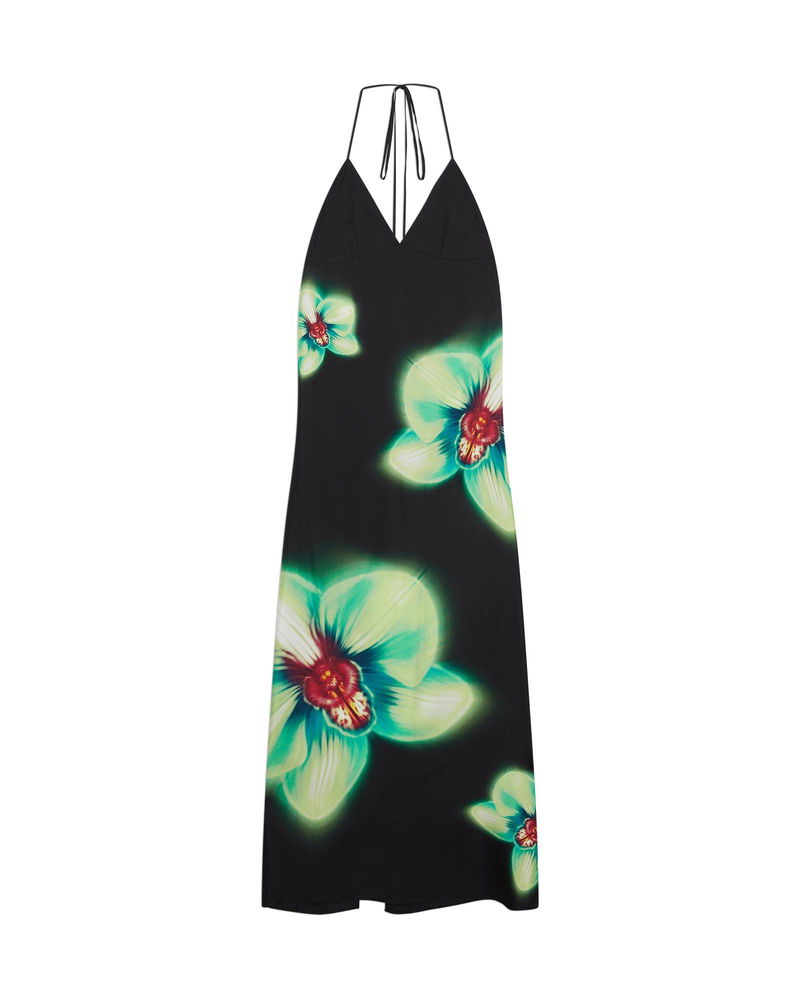 The Orchid Glitch silk dress is a halter-neck maxi-style featuring the flower of the season - the Orchid - rendered using airbrushing technique.