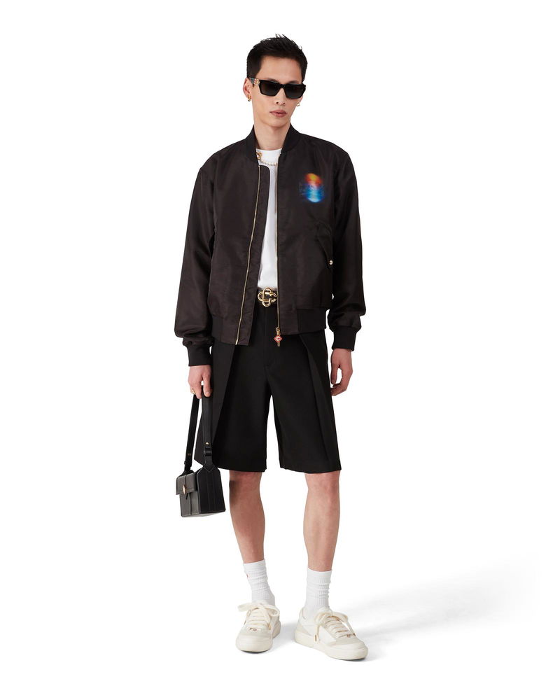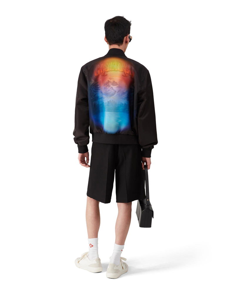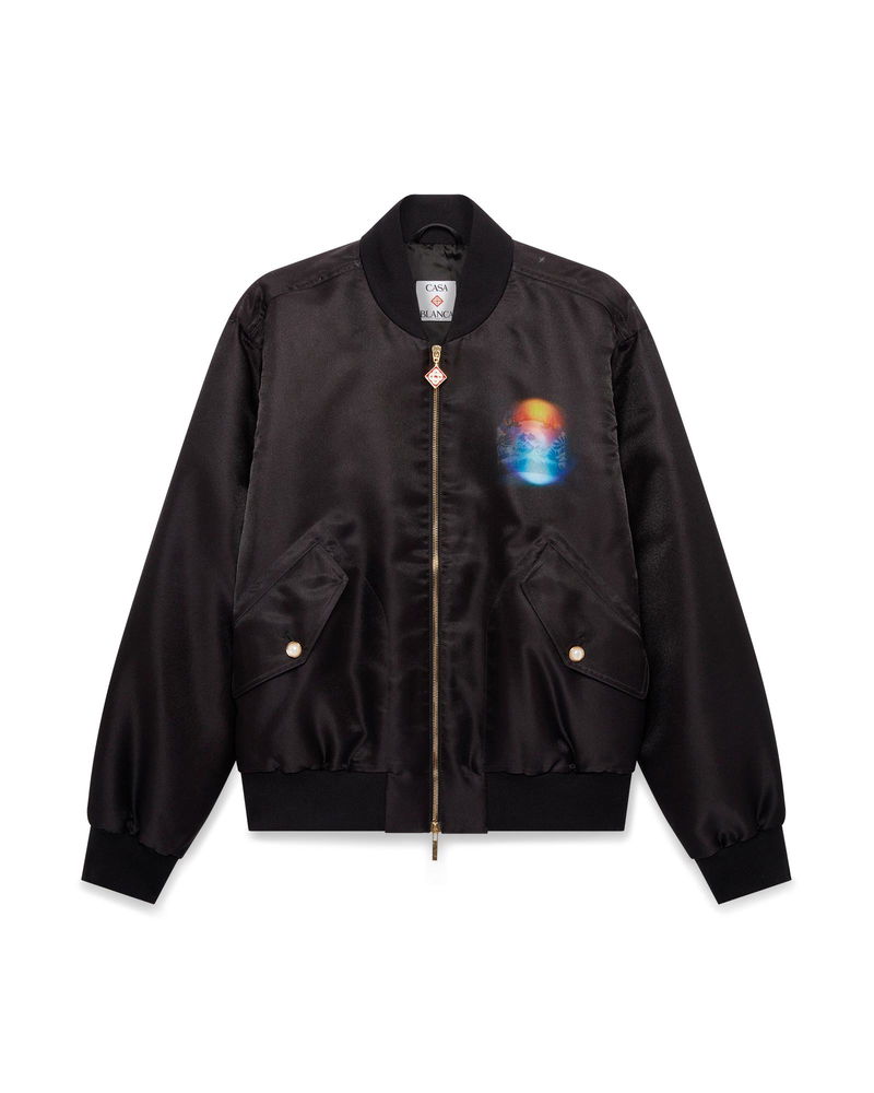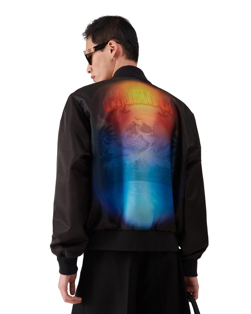 The organza gradient bomber jacket is a classic silhouette crafted from organza fabric featuring the season's gradient and La Prémonition artwork of an eerie vision of the skyline of LA at night, with UFO elements touching on vintage sci-fi inspiration - on the chest and back. Completed with a zip closure, front pockets with a flap and signature gold rim pearl button closure, and standing rib collar, cuffs and hem. Organza fabric Main 1: 100% polyester Colour: black Specialised dry clean only Made in Italy The model is 187cm/6'1 and is wearing a size M Organza Gradient Bomber Jacket, Size Small by Casablanca Paris